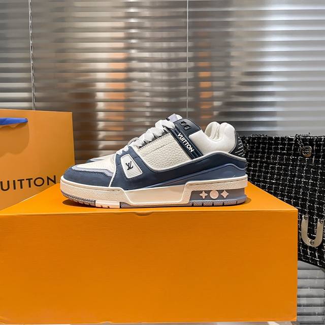 最新配色virgil Abloh 从复古篮球鞋汲取灵感,打造备受青睐的 Lv Trainer 运动鞋 此款鞋履为粒面牛皮革压印标志性 Monogram 图案,与光滑牛皮革共同成就新经典设计