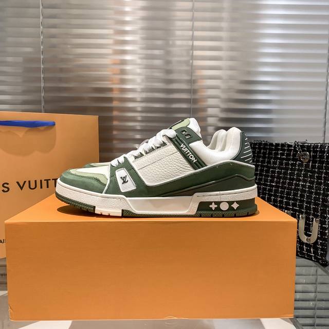 最新配色virgil Abloh 从复古篮球鞋汲取灵感,打造备受青睐的 Lv Trainer 运动鞋 此款鞋履为粒面牛皮革压印标志性 Monogram 图案,与光滑牛皮革共同成就新经典设计