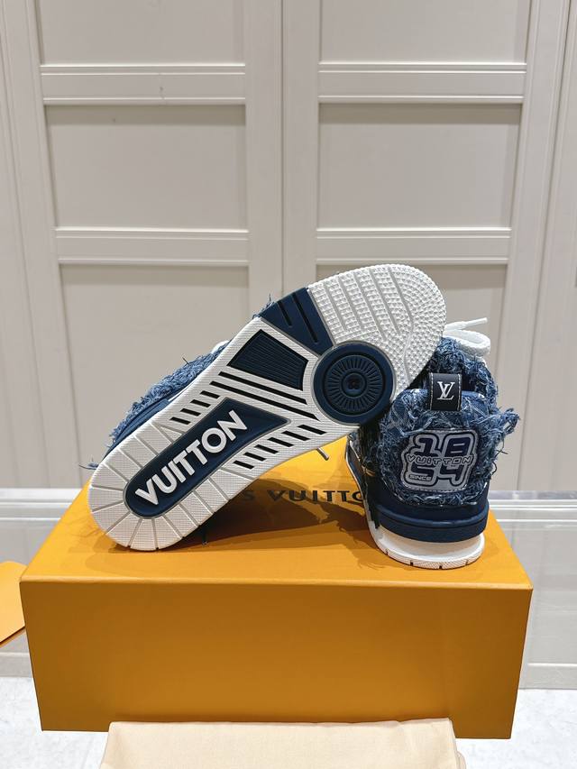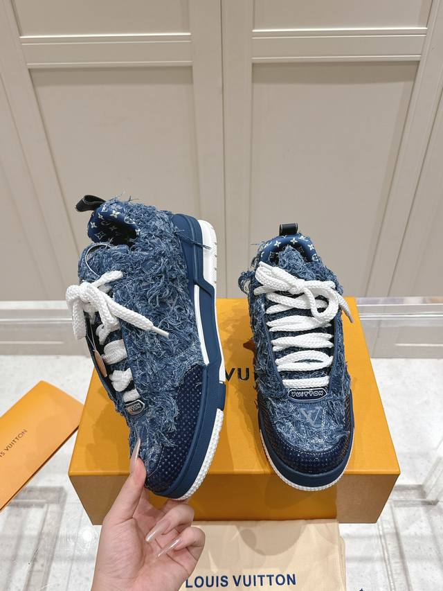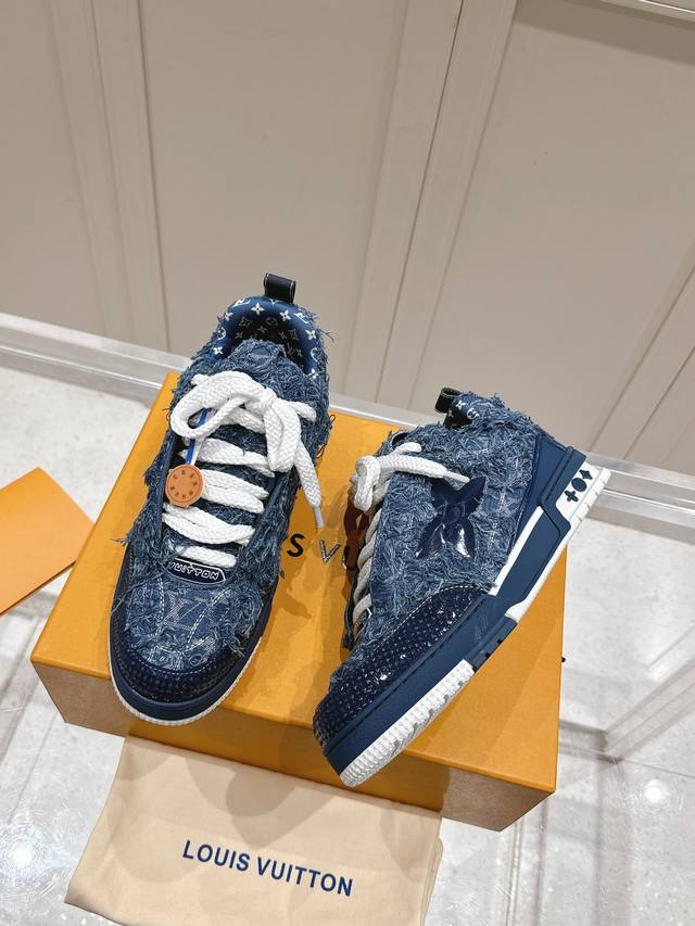 / 男款 Lv Skate 流苏运动鞋 有花卉图案在丹宁布上很复古,宽幅织物鞋带 厚实而轻盈的 Eva 橡胶外底,内里鞋垫厚度带来的脚感 鞋舌、侧面和后部饰有 Lv