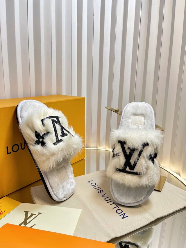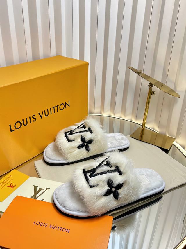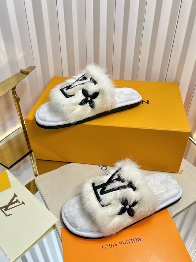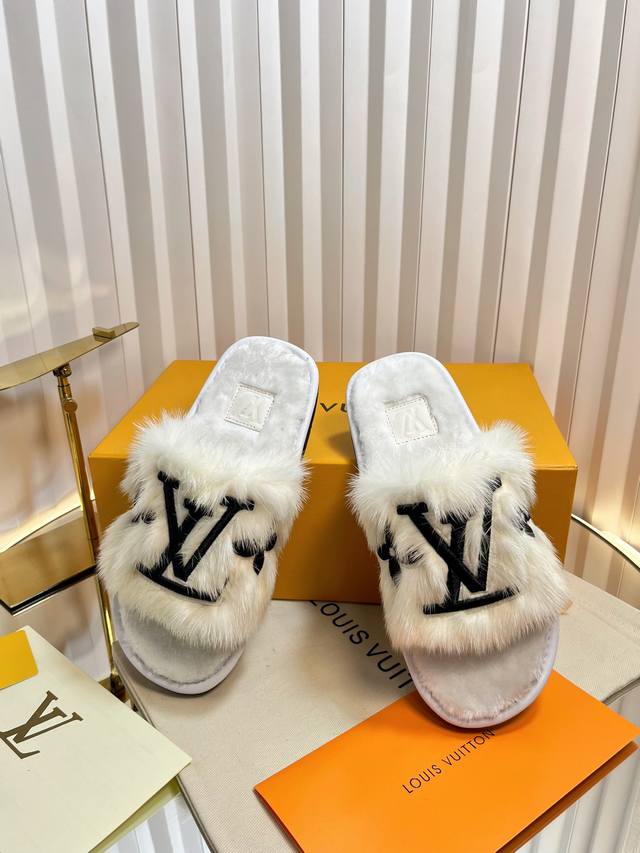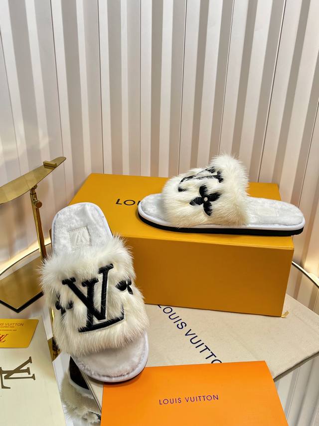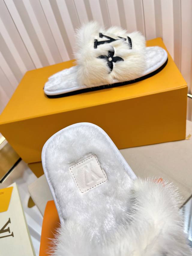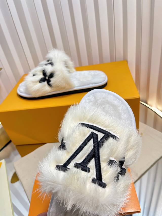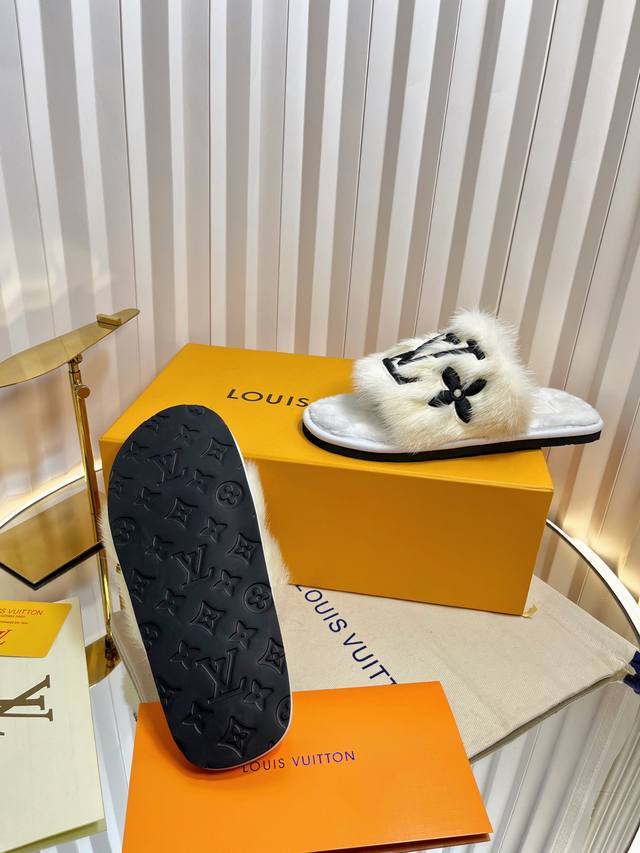 路易威*Lv新款水貂毛拖鞋,水貂毛电绣Logo面,羊毛垫脚,橡胶底,35-39码 40-42码定做不退换