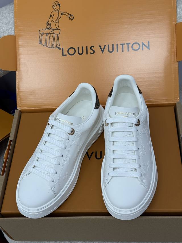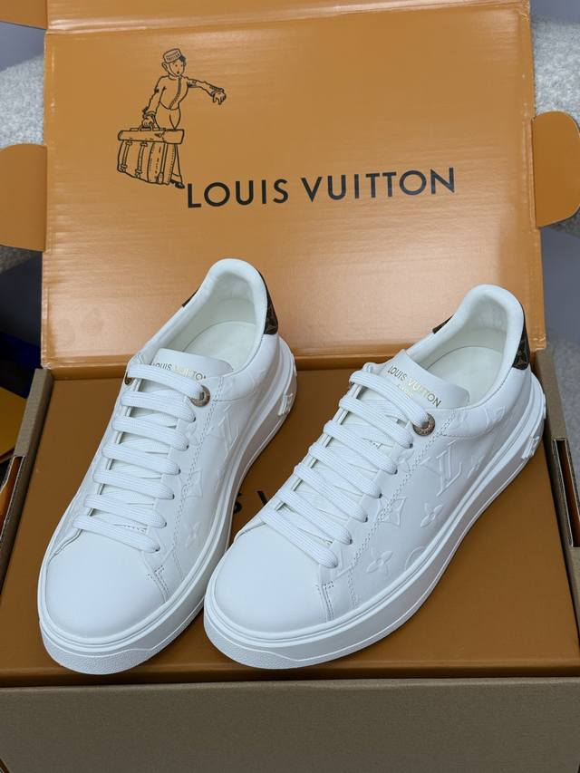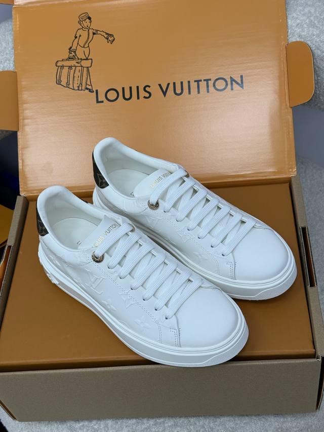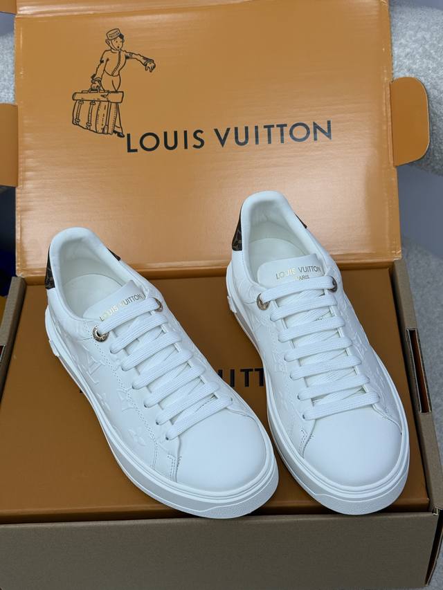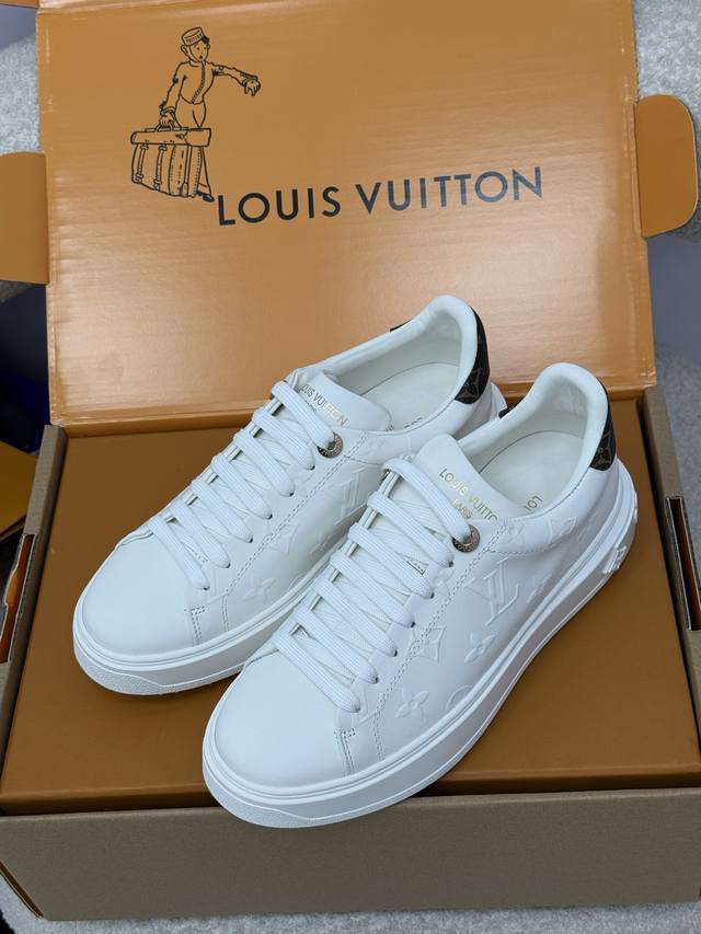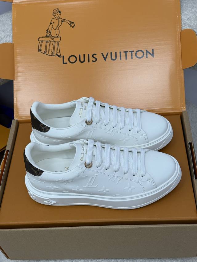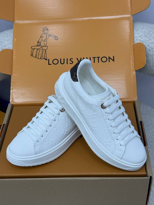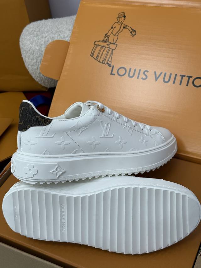 本款Time Out运动鞋取材柔软牛皮革以耀眼光泽点亮侧面Lv标识。铭纹孔眼和尾部质感皮革饰边丰富细节,加厚橡胶外底绽放Monogram花卉