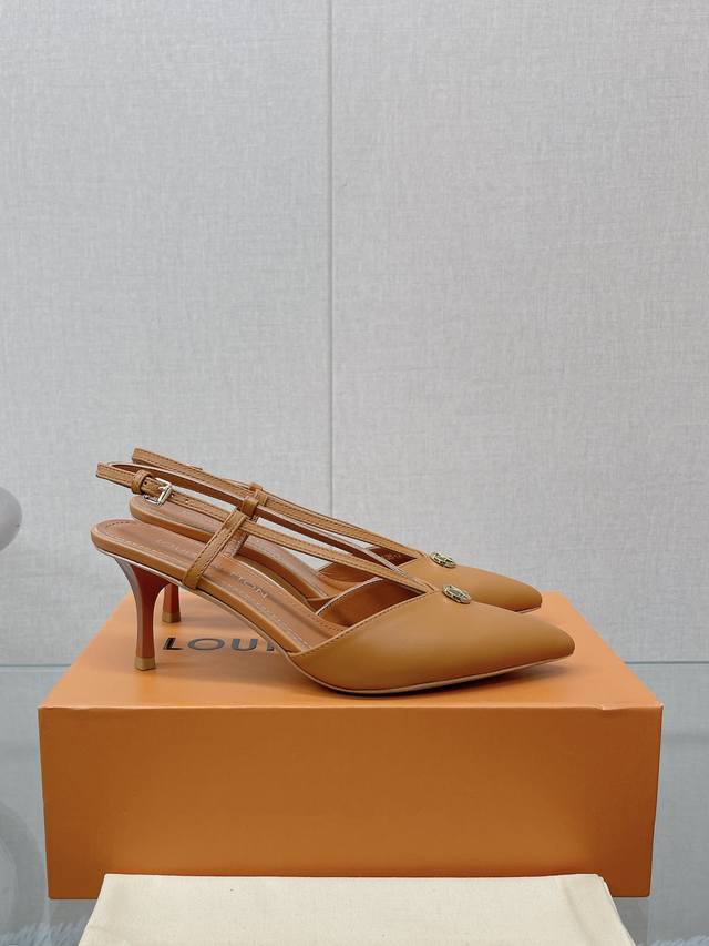 以其尖头和小猫鞋跟而闻名,其独特的星形让人想起字母组合图案 鞋面的深切v巧妙地揭示了脚,由金色品牌圆圈配件突出显示 纤细的背带用一个微小的金色扣子进行调整