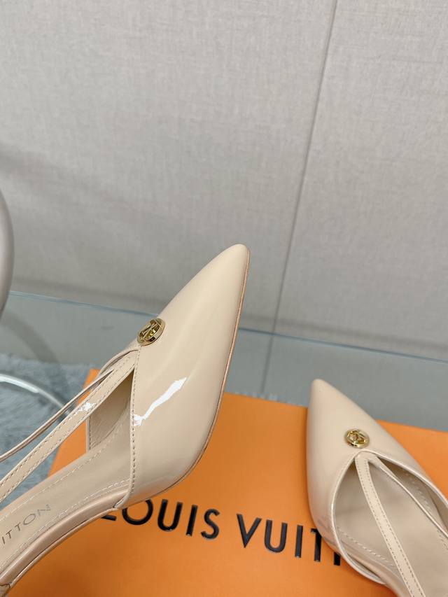 以其尖头和小猫鞋跟而闻名,其独特的星形让人想起字母组合图案 鞋面的深切v巧妙地揭示了脚,由金色品牌圆圈配件突出显示 纤细的背带用一个微小的金色扣子进行调整
