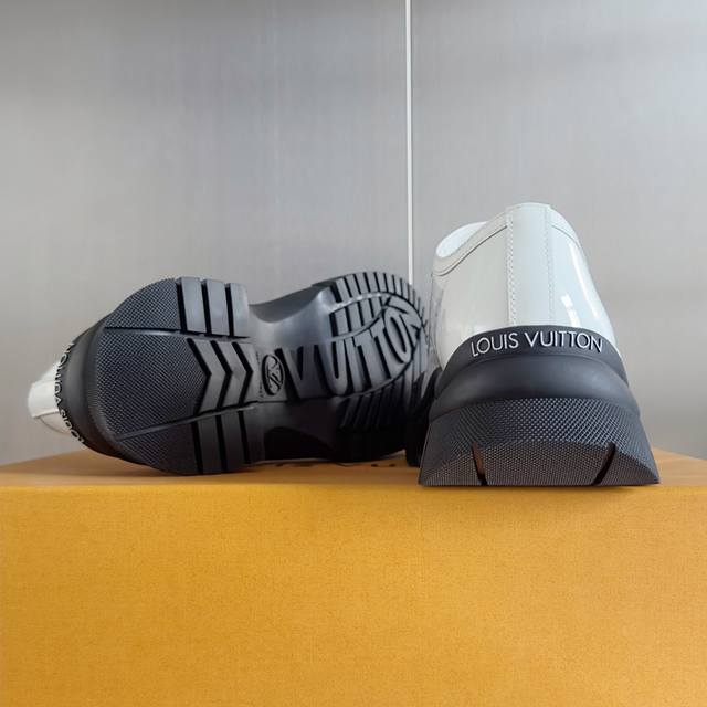 原版购入开发 做货 本款 Ruby 系带德比鞋以亮泽漆面牛皮革塑造潮流轮廓。厚实而不失轻盈的橡胶外底搭配双色鞋带,展现亦刚亦柔的前卫姿态。别致竖直棱纹与撞色路易威登标识点缀外底,点明 Ruby 系列的标志性设计