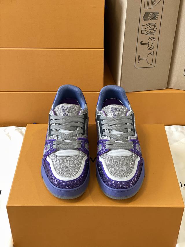 顶级版本 情侣款 本款 Lv Trainer 运动鞋闪烁水晶的炫目光芒,向设计师virgil Abloh 春夏系列推出的原版设计致敬。繁复鞋面和橡胶外底宣示经典