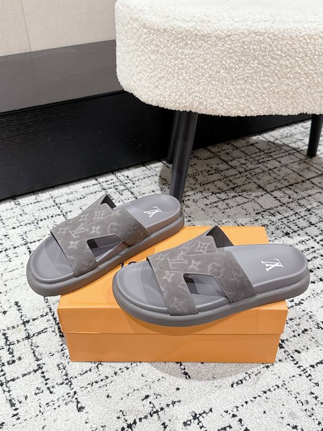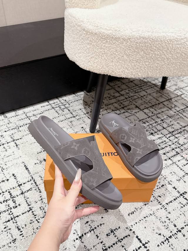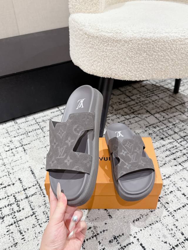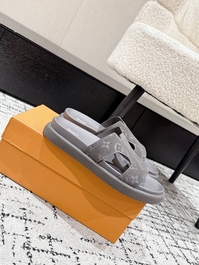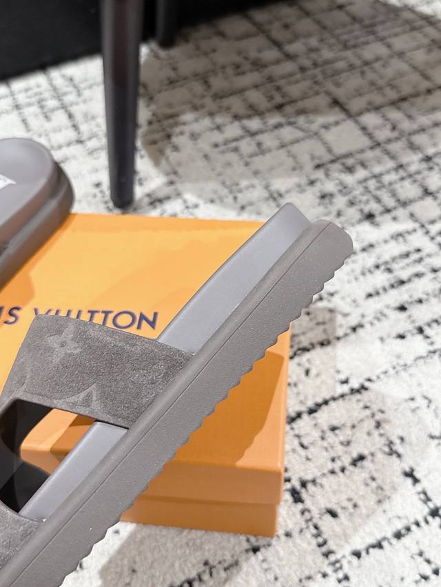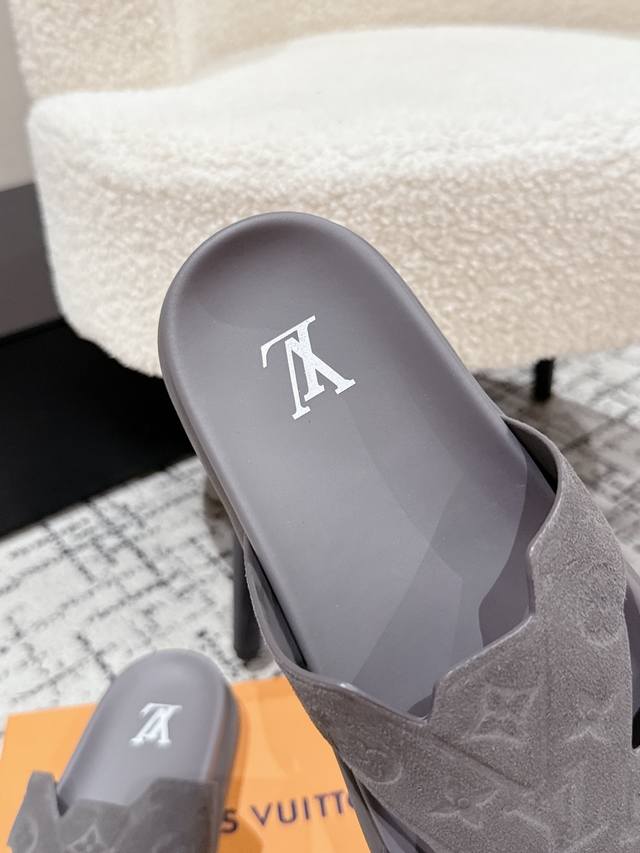 原版购入开发 做货 本款 Lv Oasis 凉拖为绒面牛皮革压印 Monogram 图案,以韧性鞋垫与微型外底成就舒适穿着体验。粗犷廓形释放休闲气息,鞋面描摹 Lv 字母的巧妙交织,路易威登标识外底再添品牌格调