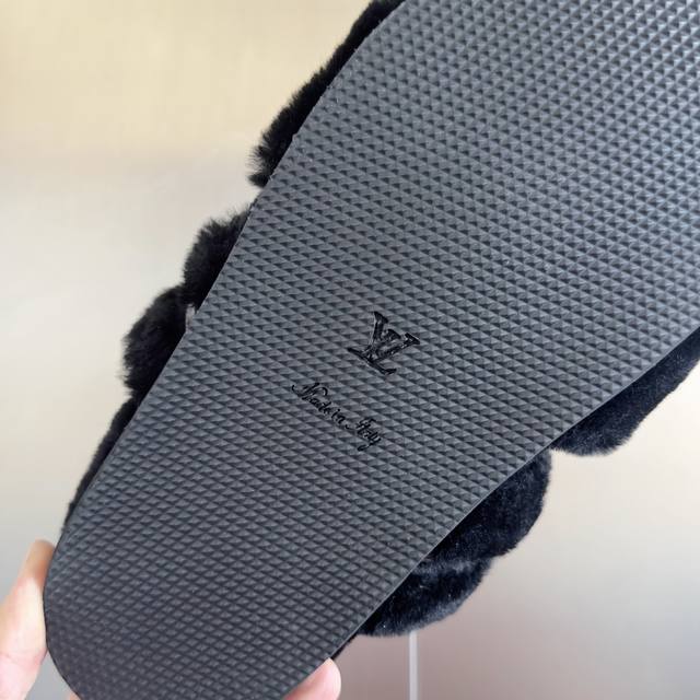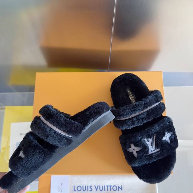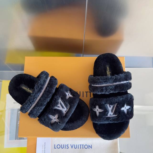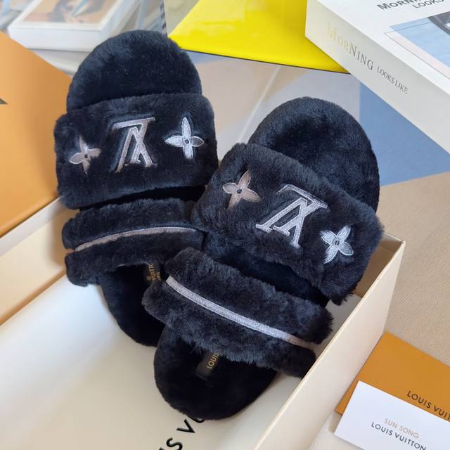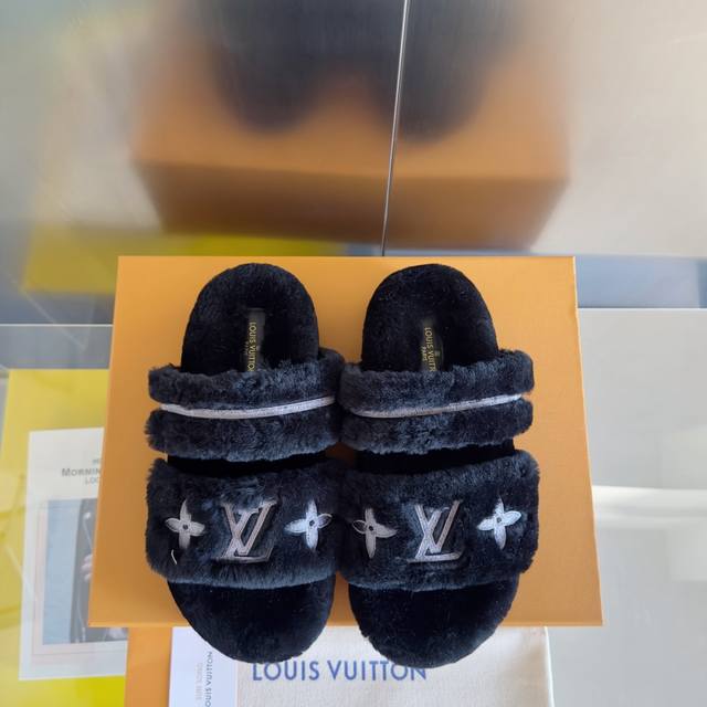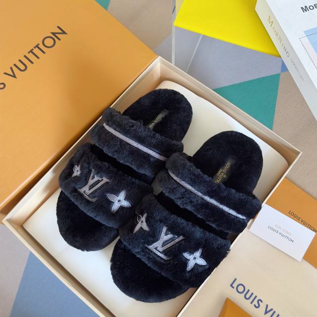 原版购入开发 做货 本款 Lv Sunset Comfort 毛绒拖鞋为柔软羊毛皮革刺绣 Lv 字母和 Monogram 花卉,再以相同材质包裹韧性鞋垫,令舒适质感再度升级。魔术贴鞋带方便调节松紧,轻盈微型外底成就室内和户外佳选