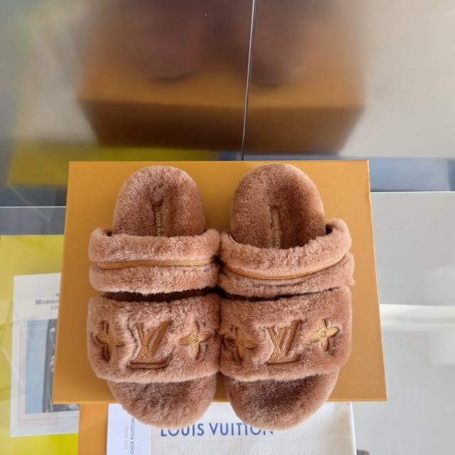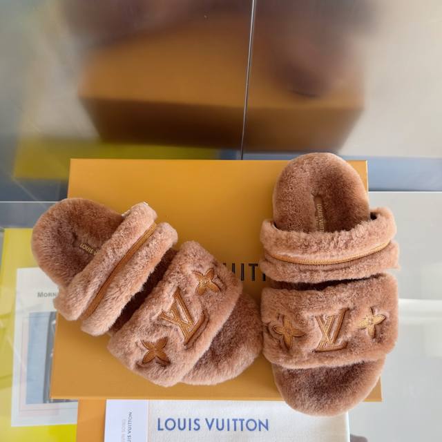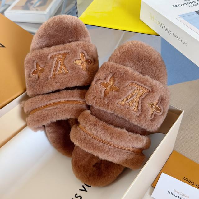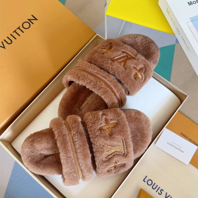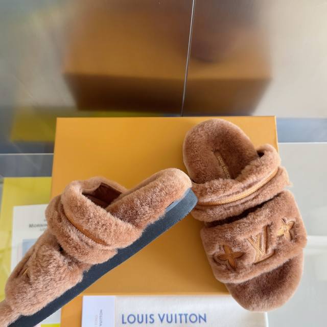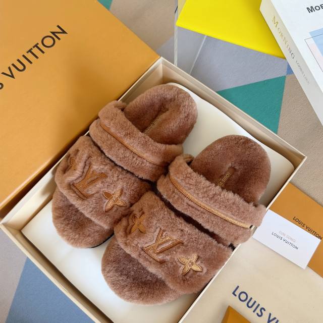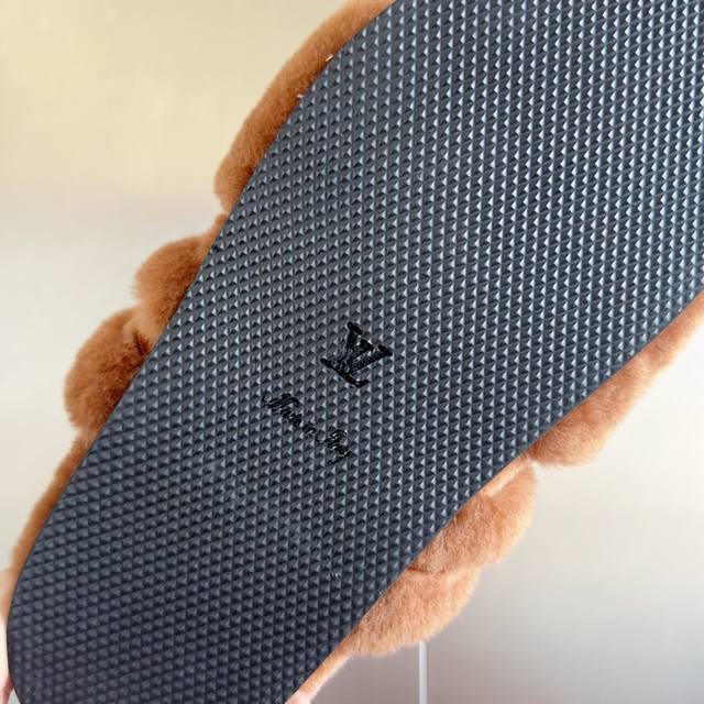 原版购入开发 做货 本款 Lv Sunset Comfort 毛绒拖鞋为柔软羊毛皮革刺绣 Lv 字母和 Monogram 花卉,再以相同材质包裹韧性鞋垫,令舒适质感再度升级。魔术贴鞋带方便调节松紧,轻盈微型外底成就室内和户外佳选