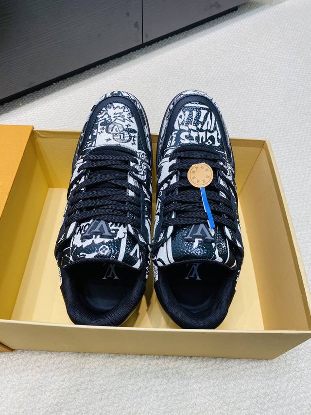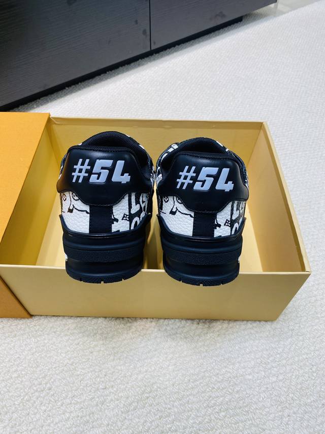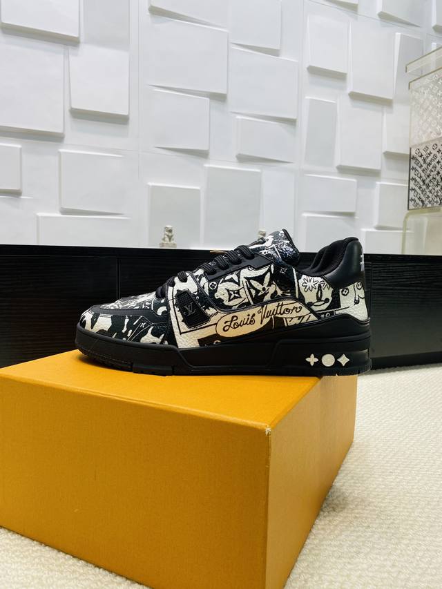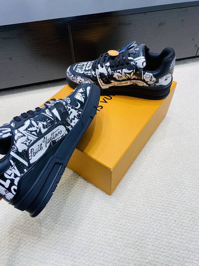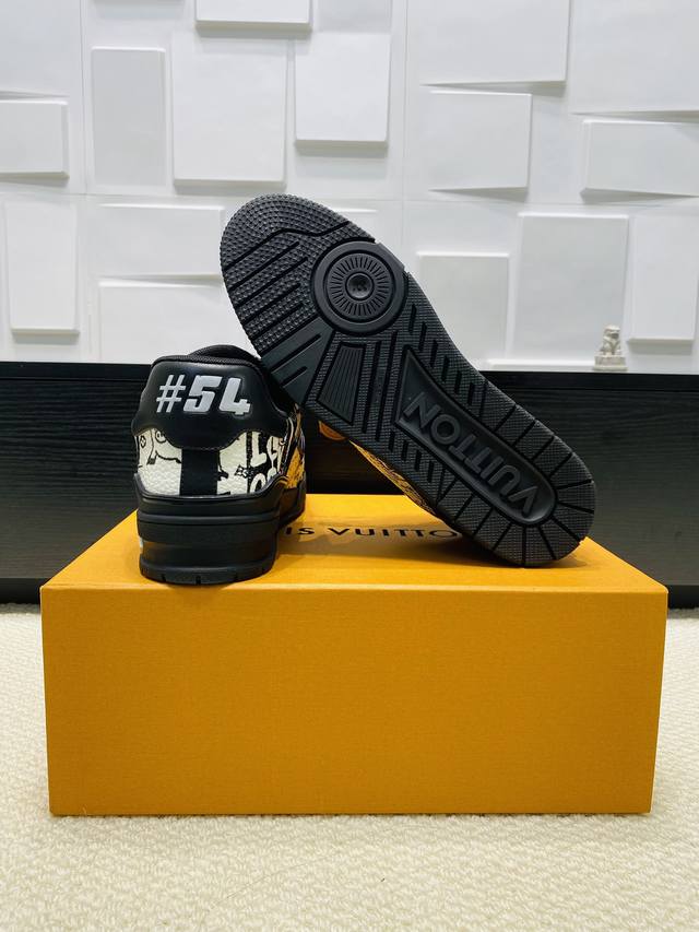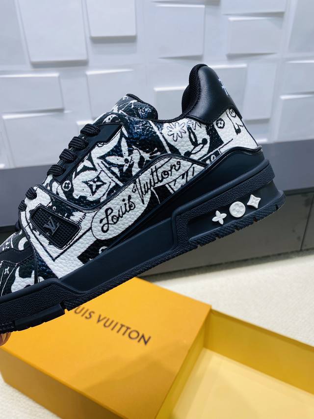 原版购入开发 路易威登 X Tyler 合作系列推出 Lv Trainer 运动鞋,延续 Virgil Abloh 基于复古篮球鞋创作的经典设计 牛皮革鞋面融入 Craggy Monogram 压纹和路易威登标识,展现 Tyler 对 Monogram 图案和品牌元素的趣味重构