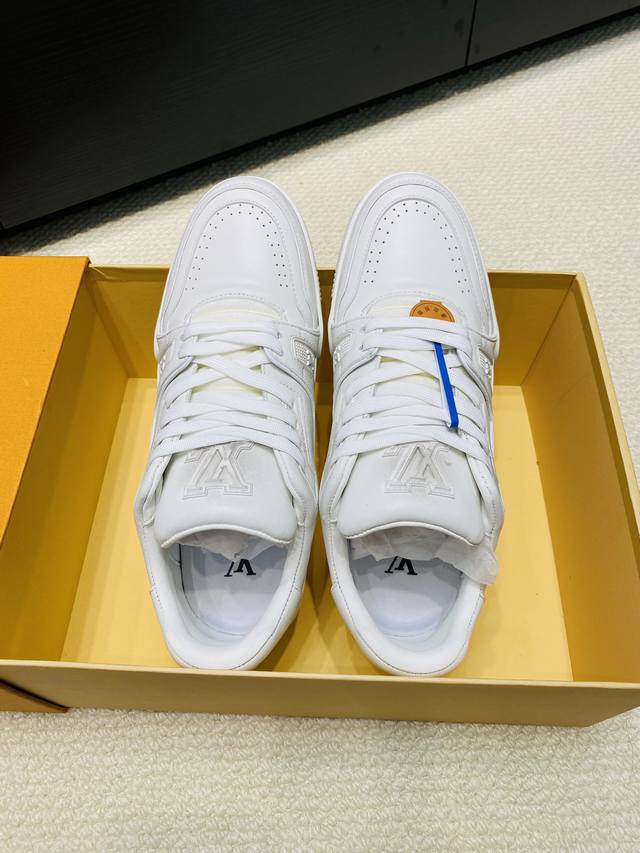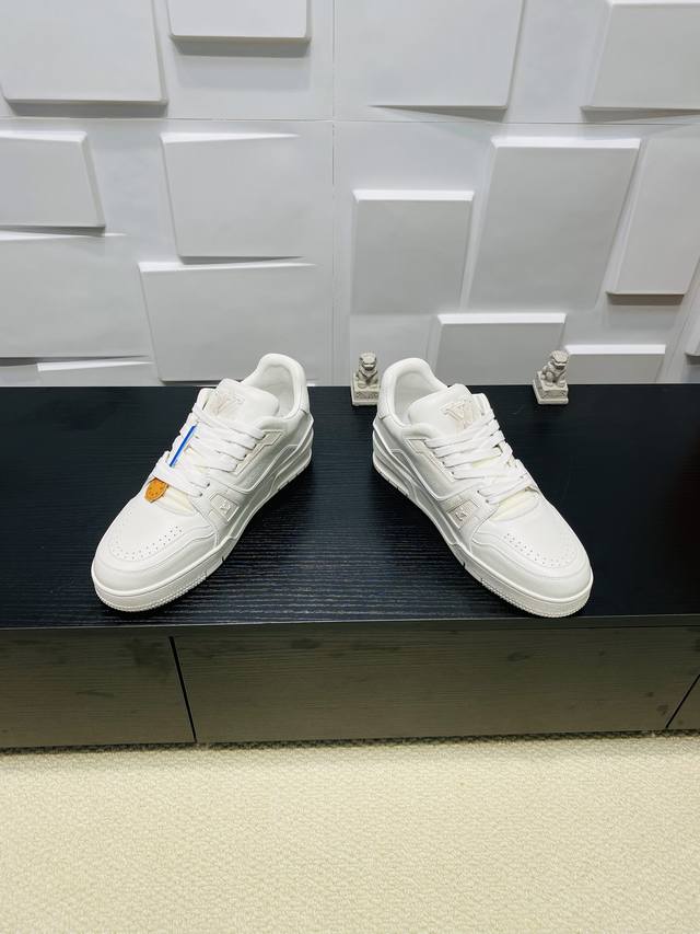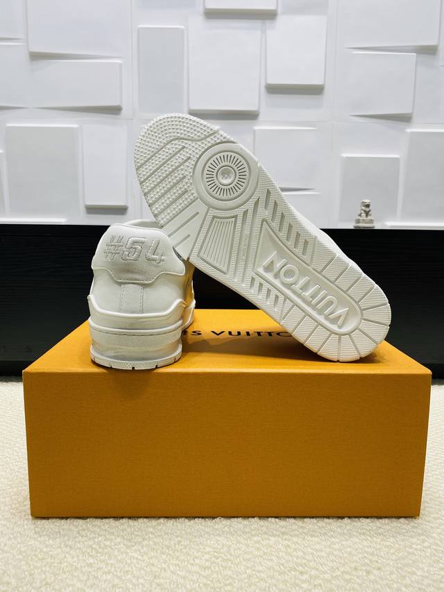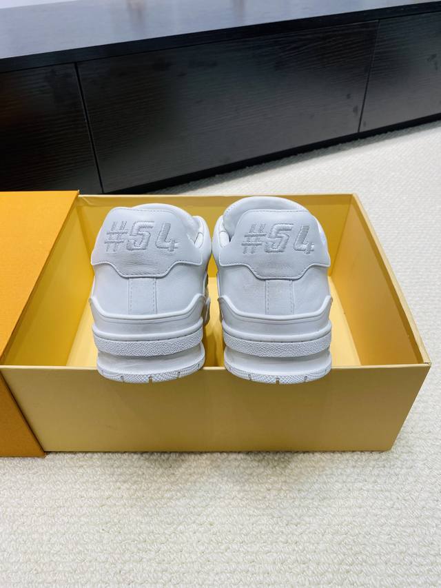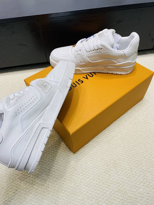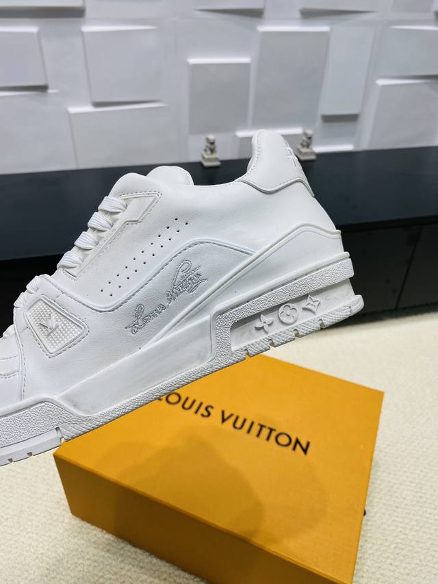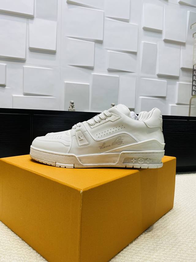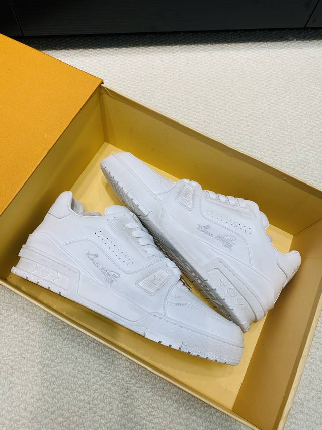 原版购入开发 路易威登 X Tyler 合作系列推出 Lv Trainer 运动鞋,延续 Virgil Abloh 基于复古篮球鞋创作的经典设计 牛皮革鞋面融入 Craggy Monogram 压纹和路易威登标识,展现 Tyler 对 Monogram 图案和品牌元素的趣味重构