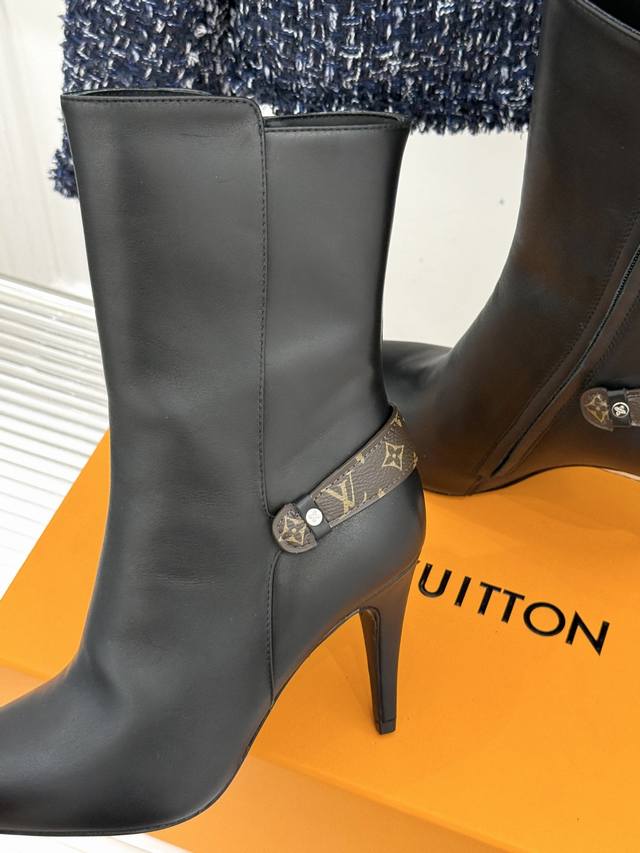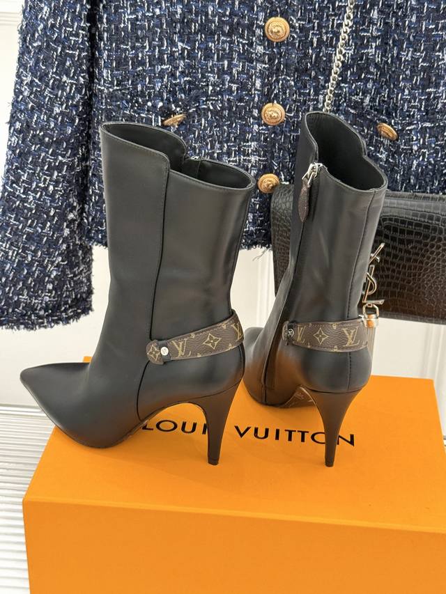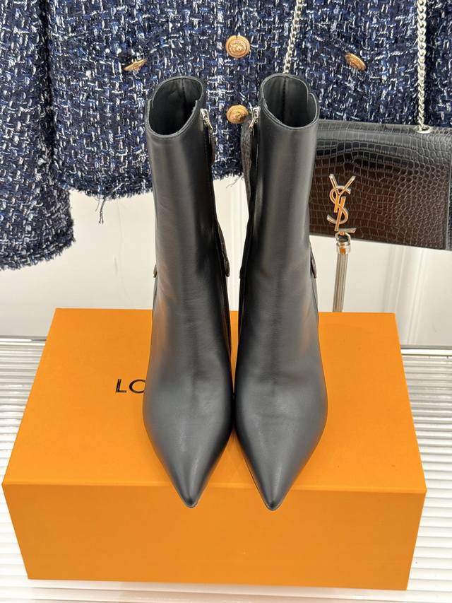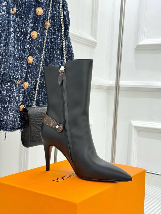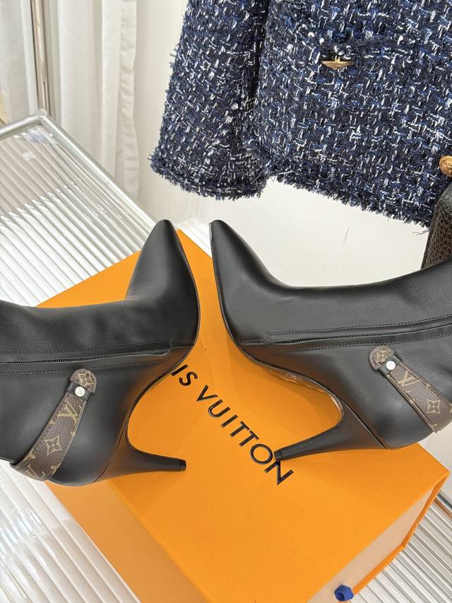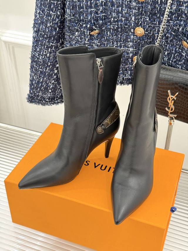 驴牌秋冬新品老花皮带扣尖头高跟短靴