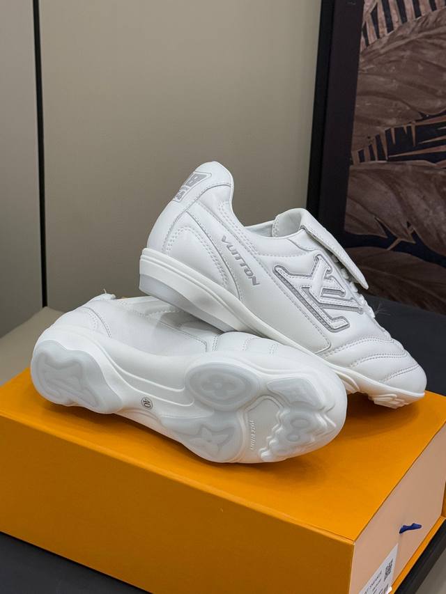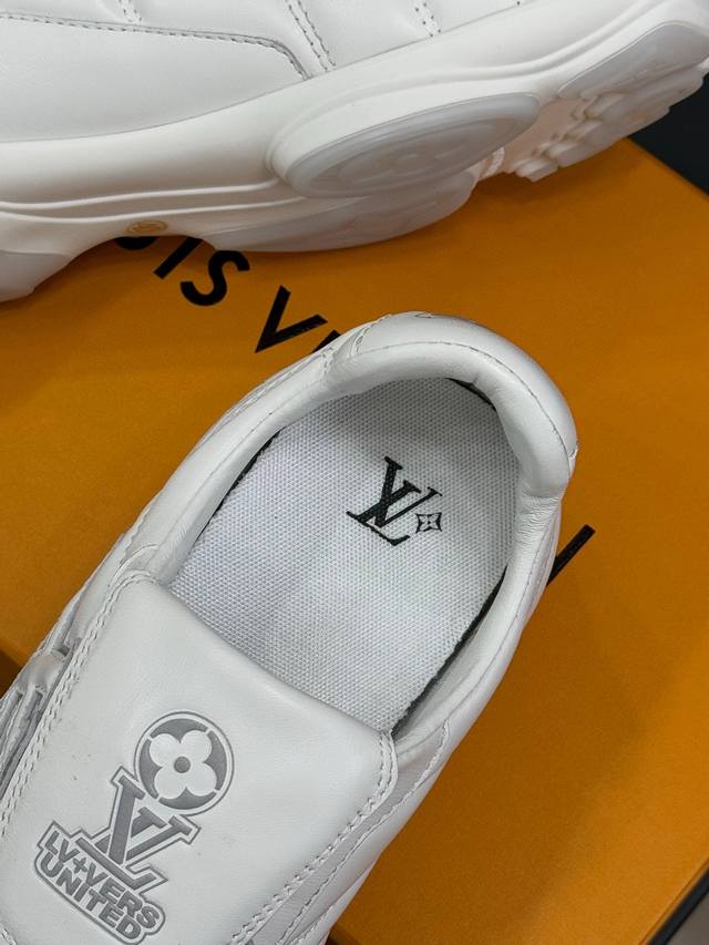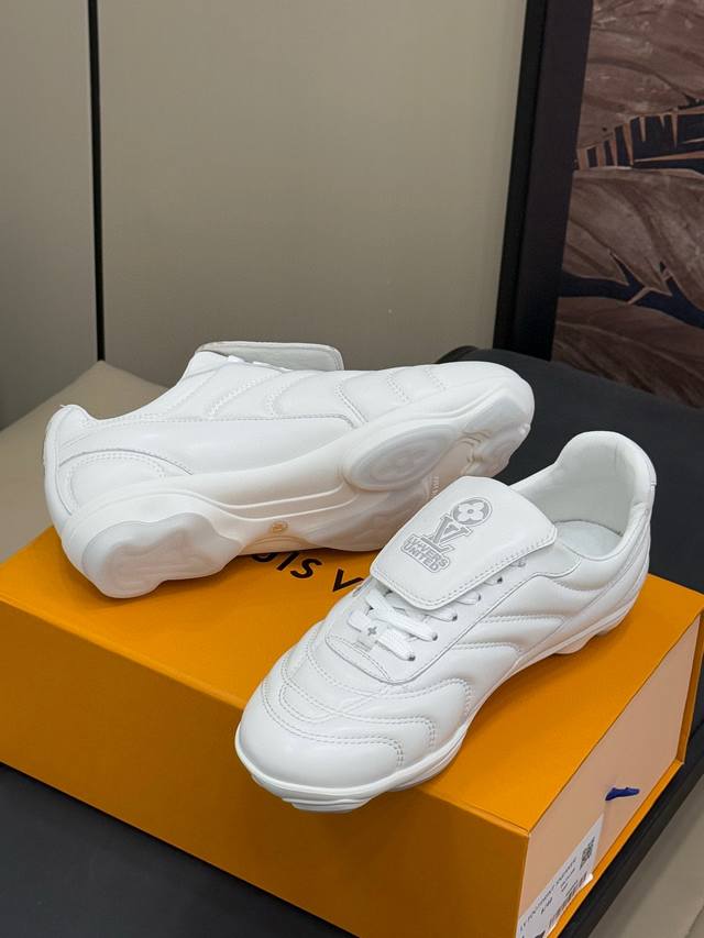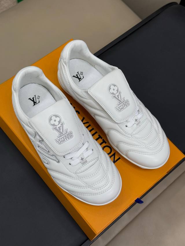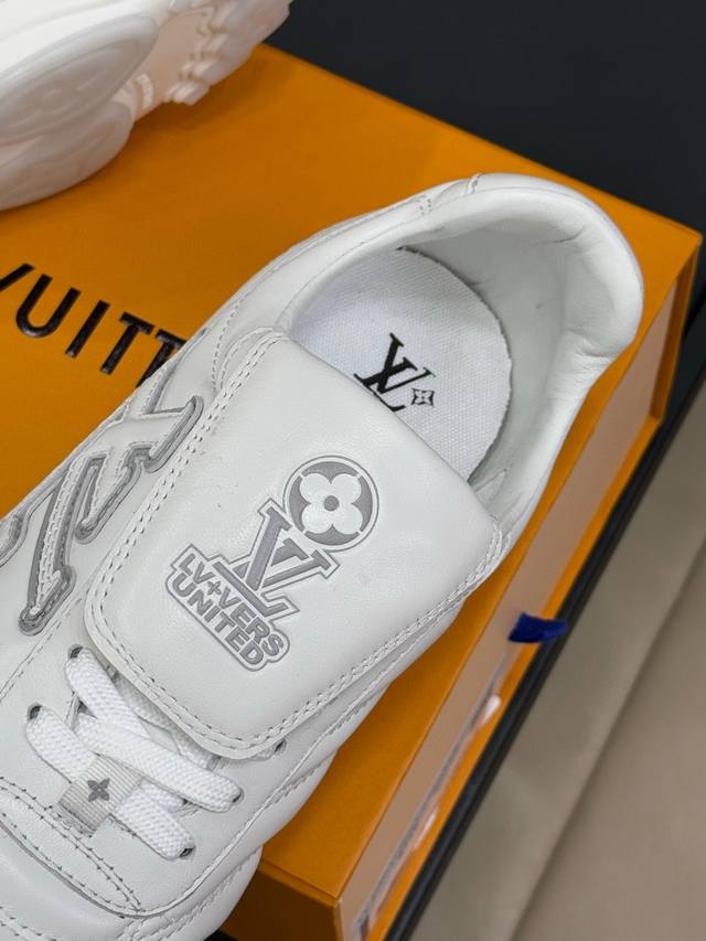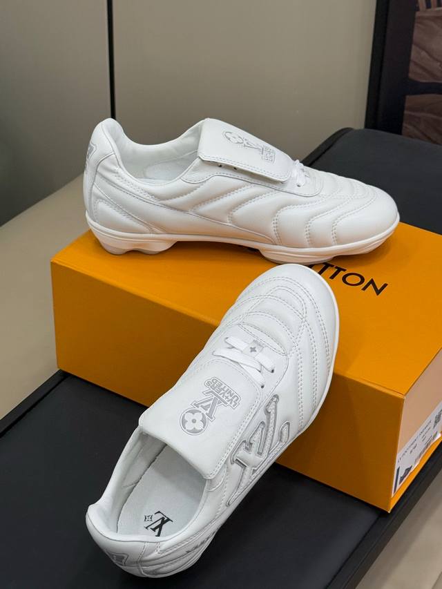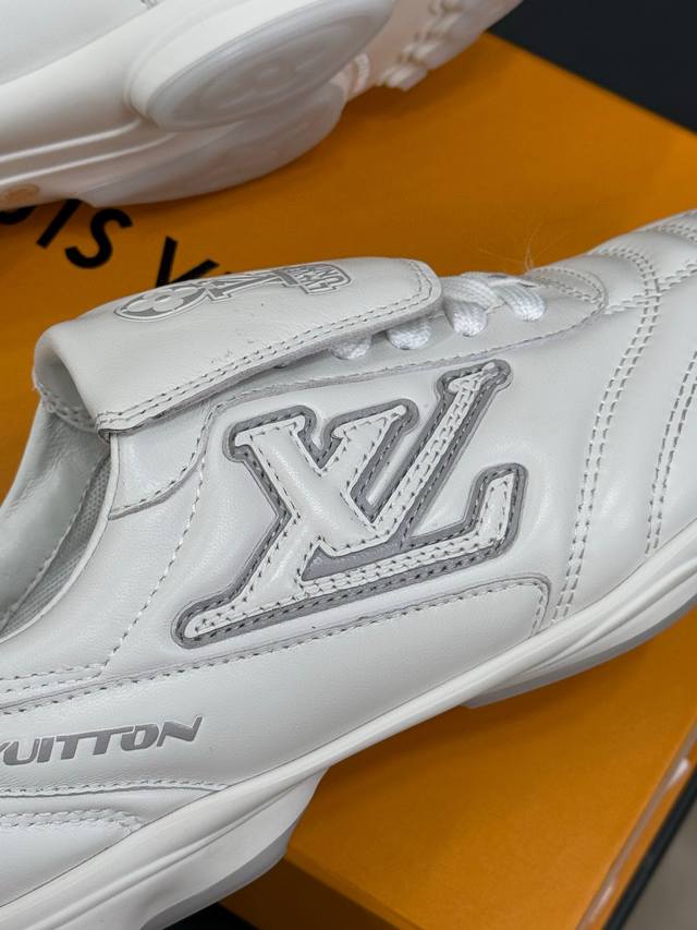 缀,鞋舌缀有灵感来自足球队伍的 Lvers United徽章,而脚掌纹橡胶鞋底饰有多款路易威登标志。
