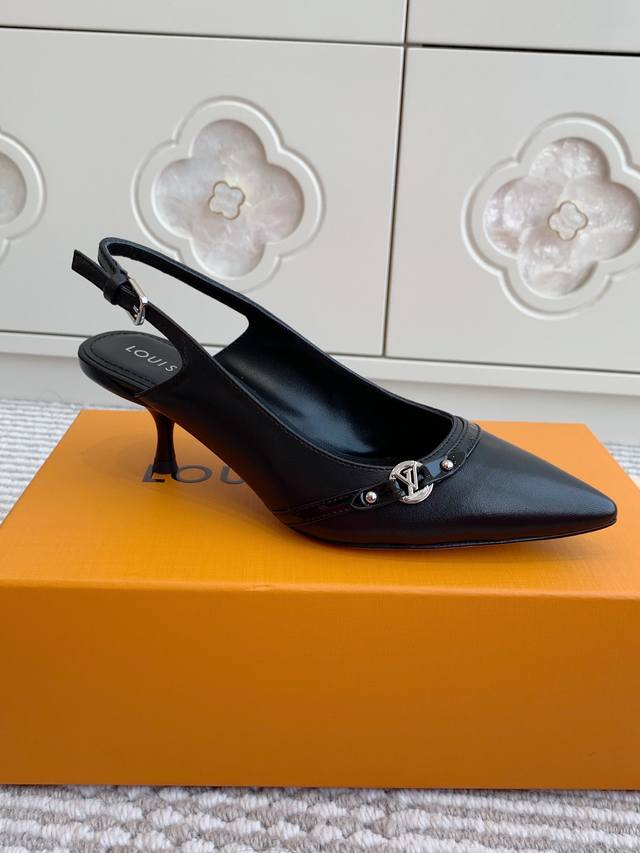 本款 6Am 露跟高跟鞋为柔软羊皮革鞋身搭配漆面皮革饰带。精巧饰钉点缀 Lv Circle 标识装饰。尖头与小猫跟释放柔美风情。纤细搭扣饰带系紧后部。