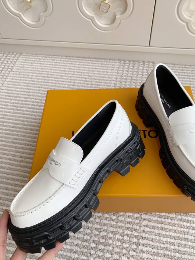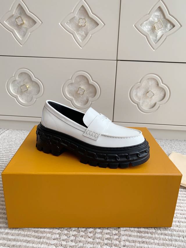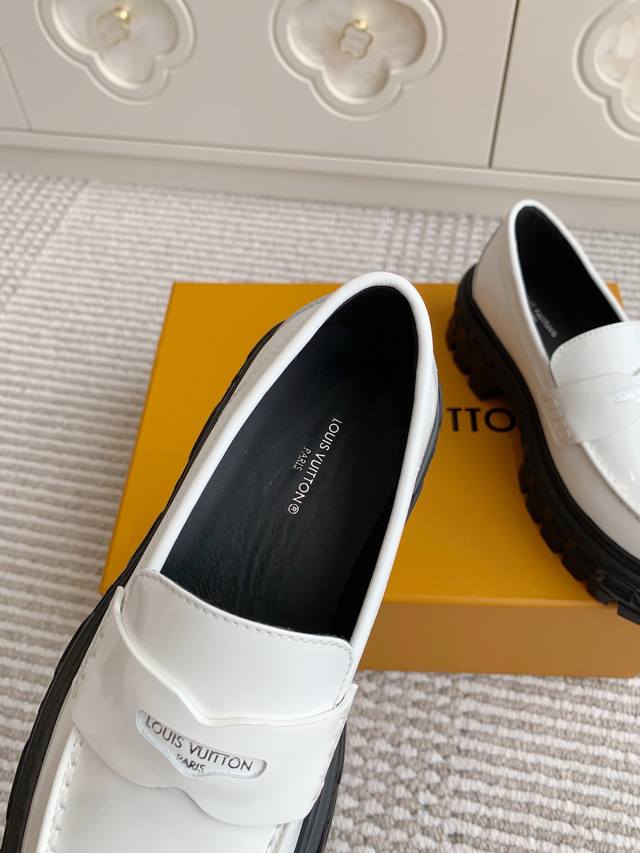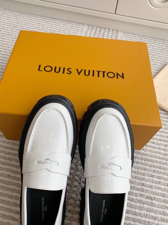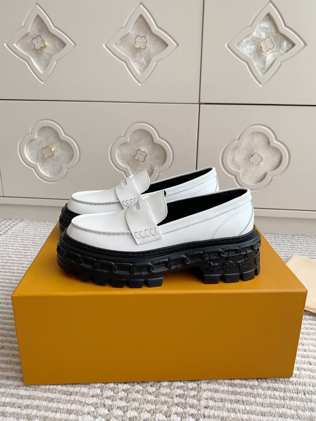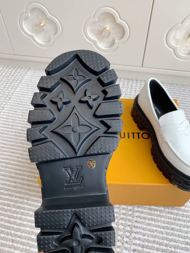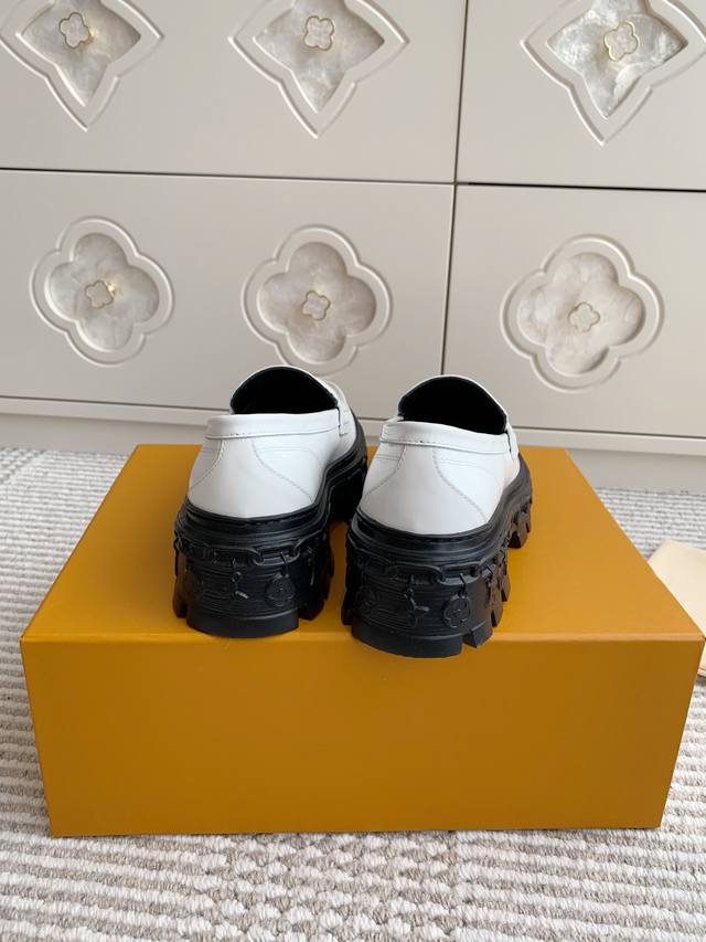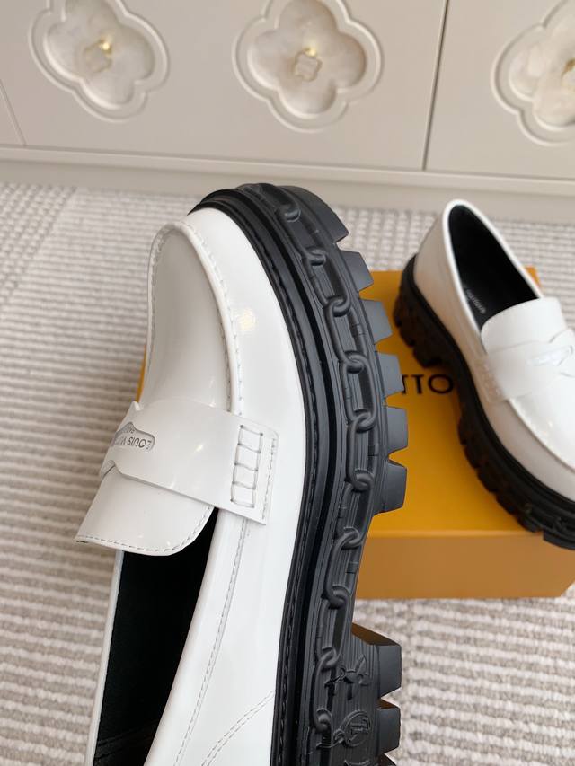 本款 Lv Record 乐福鞋以镜面牛皮革呈现撞色设计,搭配压印路易威登标识的饰带。繁复 Eva 橡胶外底厚实而轻盈,为醒目航海风格链条图案融入 Lv Circle 标识和 Monogram 花卉。