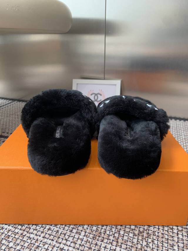 Lv 最新版面new Arrival ~毛毛鞋半拖毛拖 Winterbreak Comfert 平底拖鞋 Lv 金属字母扣 室内外穿着皆宜。纯羊羔毛材质,鞋面受