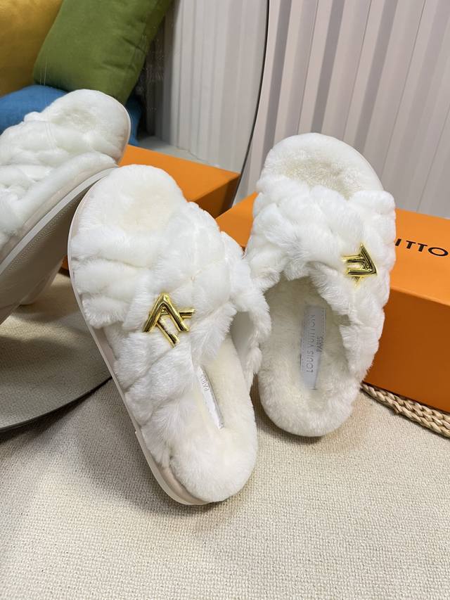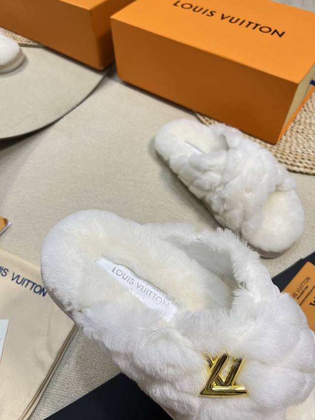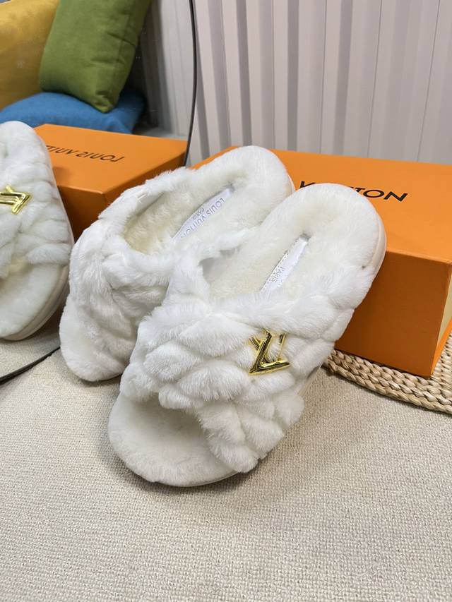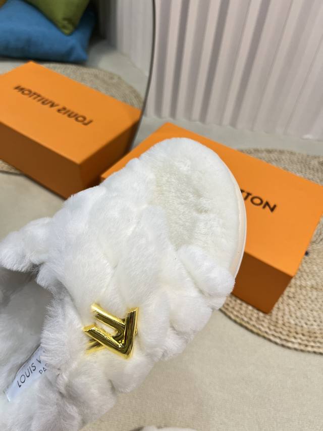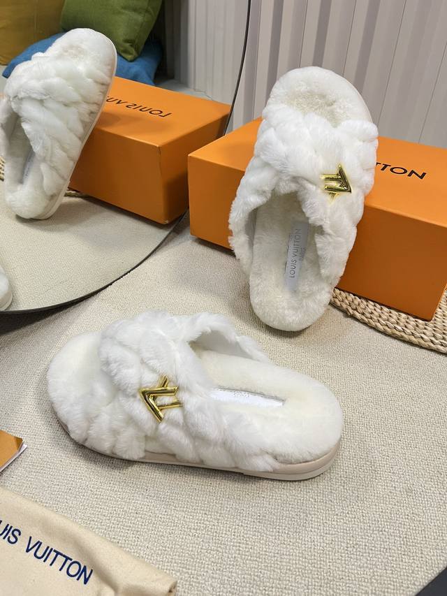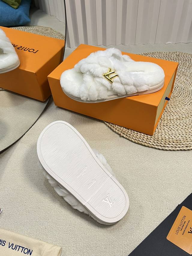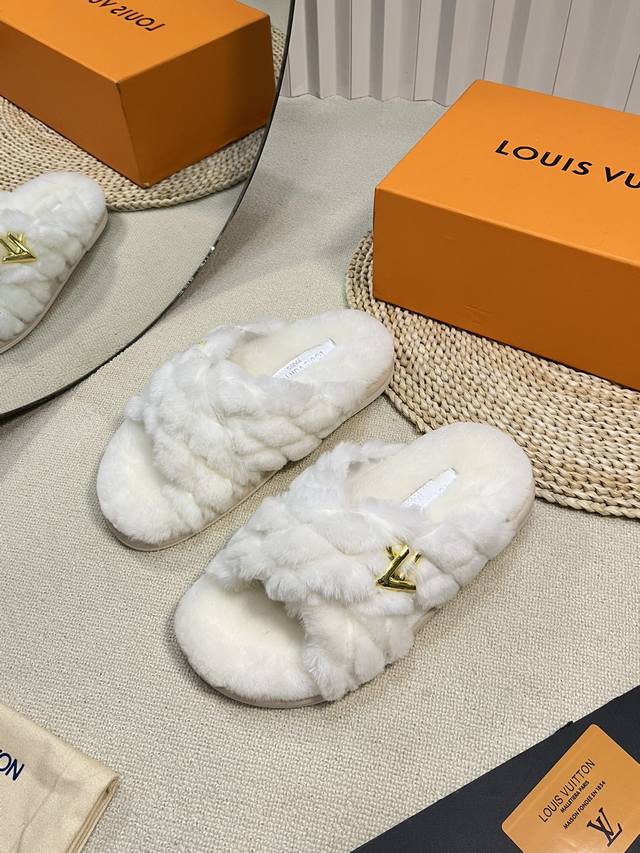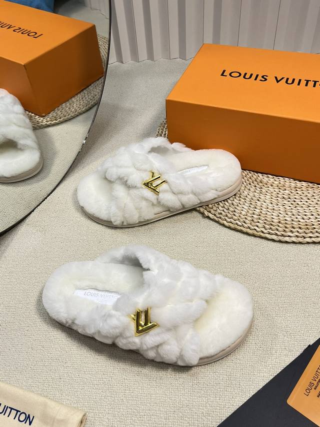/ lv 路易威登 24 新款 毛拖 高品质闭眼入!弹力羊皮踩上去更加柔软舒服,采用进口皮毛一体羊羔毛 内里皮里 金色五金扣 原版高密度发泡底 Size:# 35-
