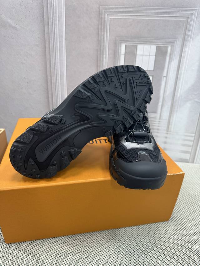 本款 Lv Olympia 运动鞋融合网格面料与金属质感合成皮革等科技面料,以利落简约设计重绎经典跑鞋设计。轻盈 Eva 外底成就舒弹穿着体验。Monogram 压纹与 Lv 字母等丰富细节树立辨识度