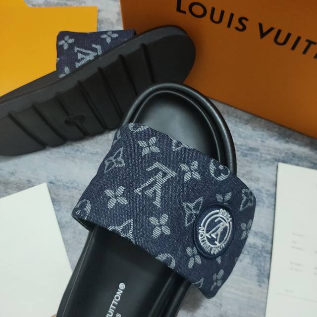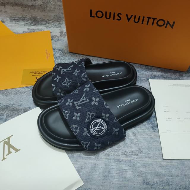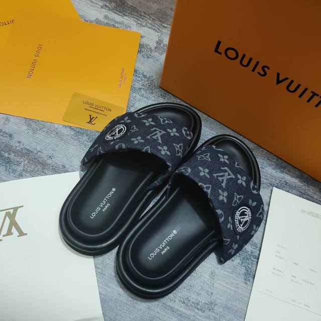 / 出厂价pp: 早春新品上市 Louis Vuitton 路易威登 爆款情侣压花拖鞋超级百搭瘦腿神器厚底设计活力十足,上脚舒适优雅 面料:牛仔布/卬花 内里:水染