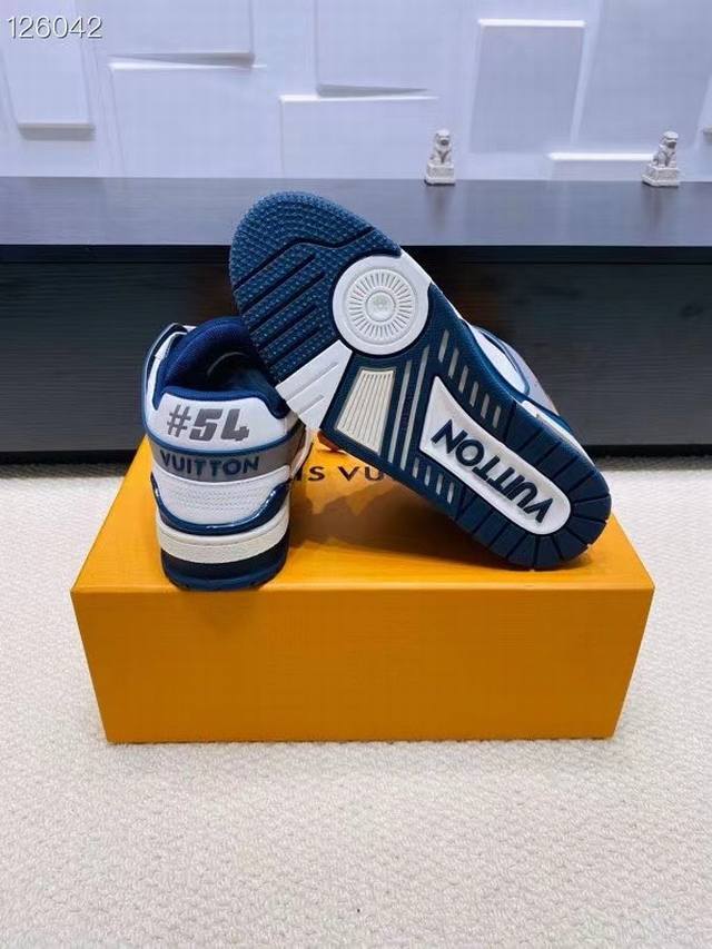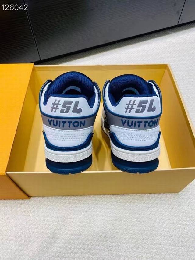 采用头层牛皮制成,进口定制专用印花牛仔布包裹,粗鞋带系带设计,侧面带 Monogram 大印花, 鞋舌及后跟”Lv 54“徽章点缀,橡胶外底饰有 Monog