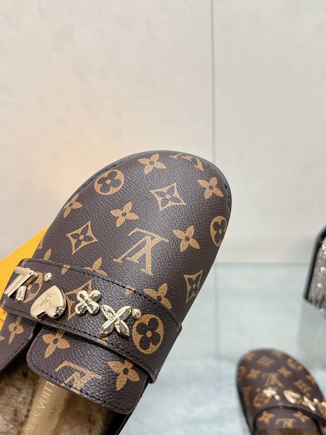 LV 字母和Monogram 花卉点缀图案的皮面,搭配羊毛内里,室内外穿着皆宜。