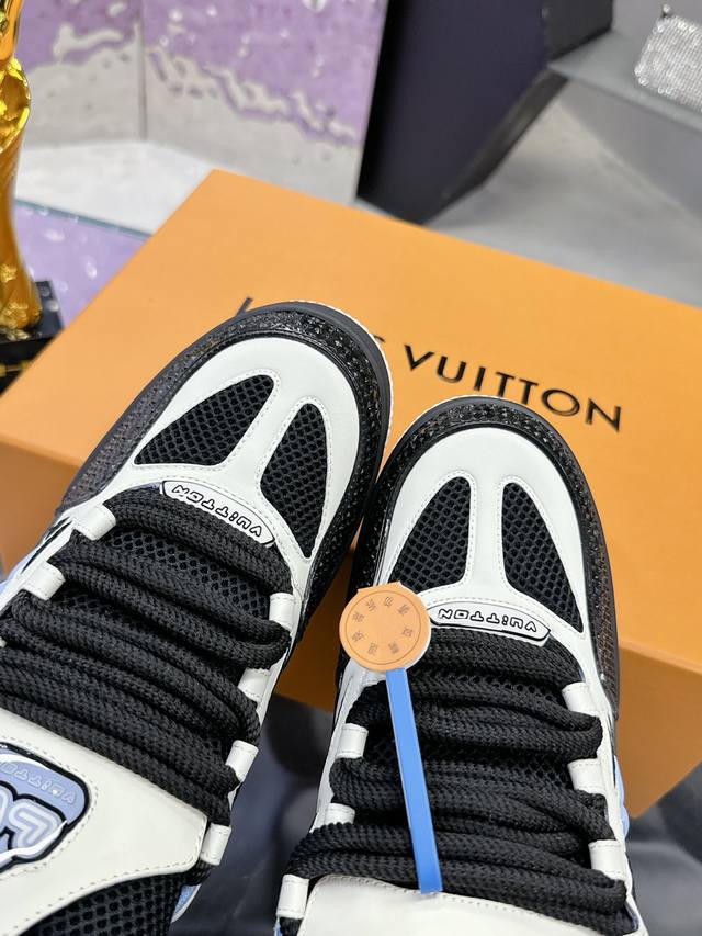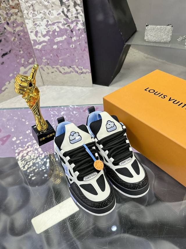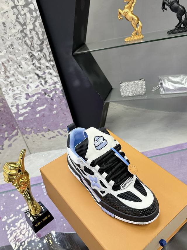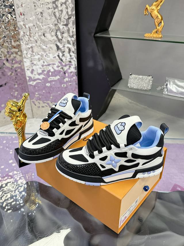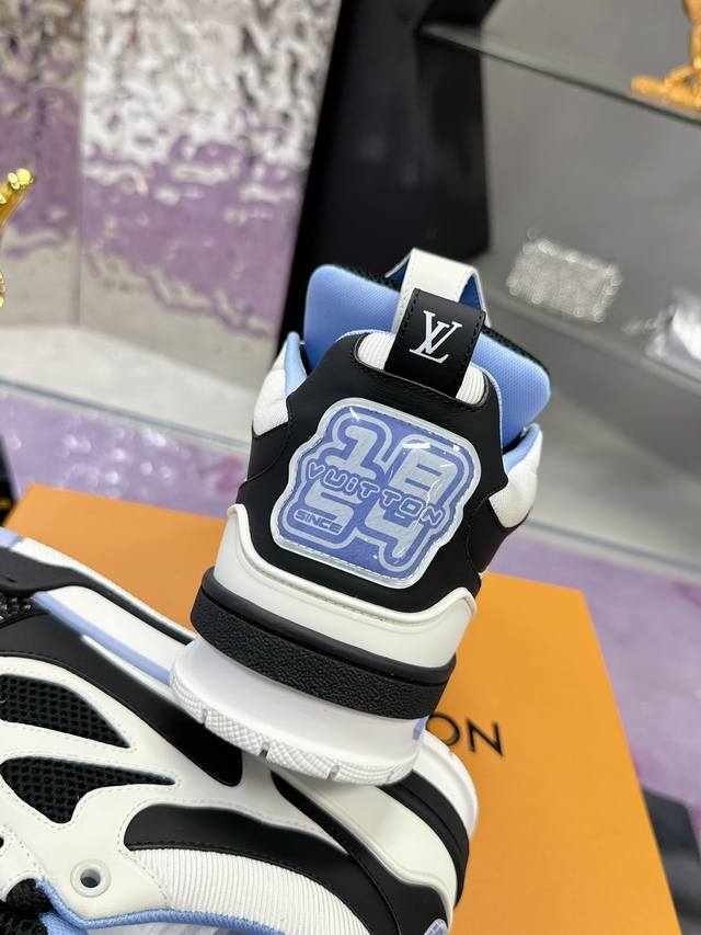 路易威登走秀滑板鞋爆款, LOUIS VUITTON Trainer无疑是奢侈品牌推出的最成功的Sneaker之一,不过探索的脚步并不会停,LOUISVUITTON也将在2024年春季带来全新滑板鞋系列。图中新系列回到了90年代 Chunky Skate Shoes既视感,皮革与网面打造鞋面,肥大的廓形与粗鞋带都非常惹眼,预计也会像Trainer一样拥有相当多的配色。结合此前 DIOR秀场滑板鞋来看,明年或许这股Chunky风会更加强劲。 Lv