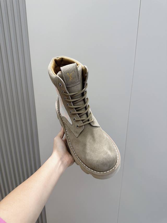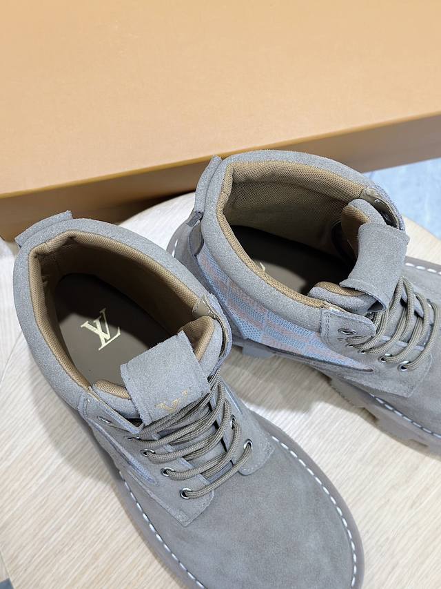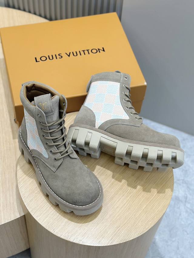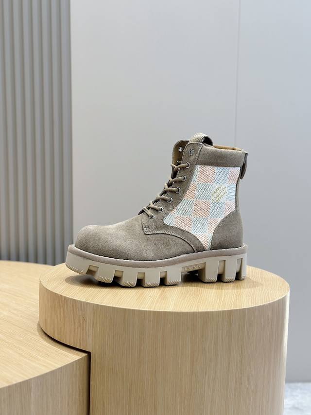 本款 Lv Checker 平底靴以正绒面牛皮革搭配舒暖羊毛皮内衬,以崭新风姿迈入冬季视野。鞋面局部压印 Damier 图案,凸纹外底延续相同元素。稳健鞋型演绎军靴风范,科技鞋带与便于穿脱的侧拉链彰显功能考量。