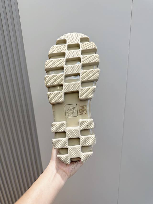 橡胶外底,鞋底凸纹饰有 Damier 图案marque L. Vuiton Deposee 标识