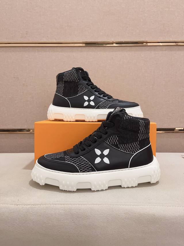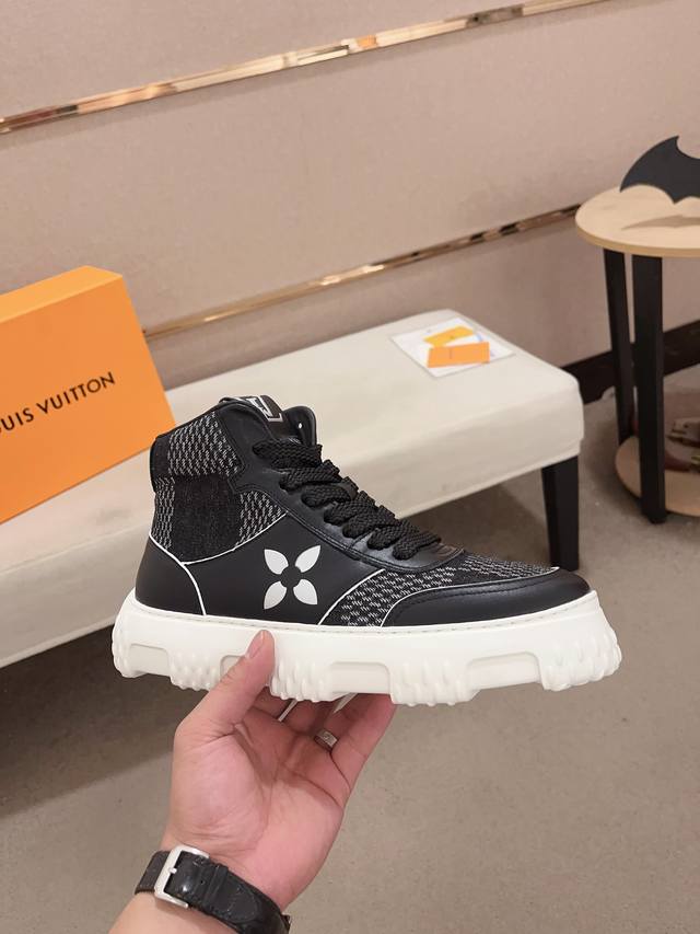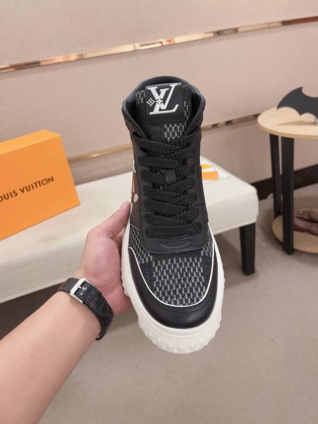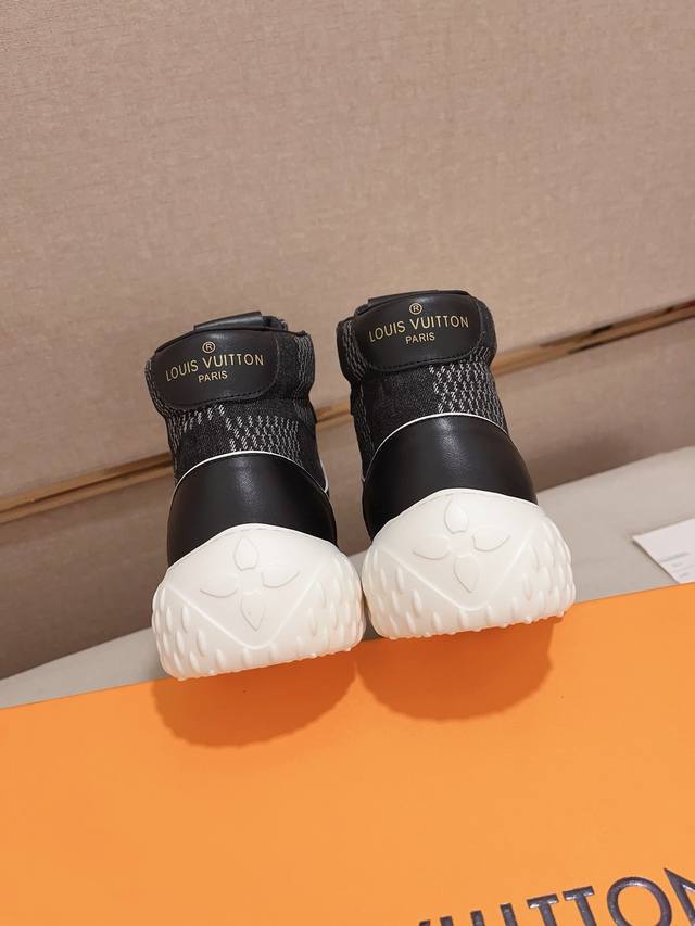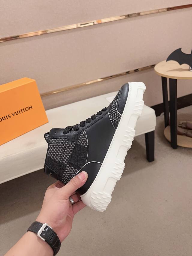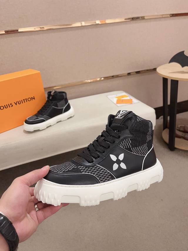 工厂价: LV~路易威登潮流男鞋 新款高帮出货 最新搭配 官网同款 超高品质 当季热卖 精选头层牛皮 舒适牛皮内里 原版套楦 上脚舒适 耐磨橡胶大底 码数:38-44。