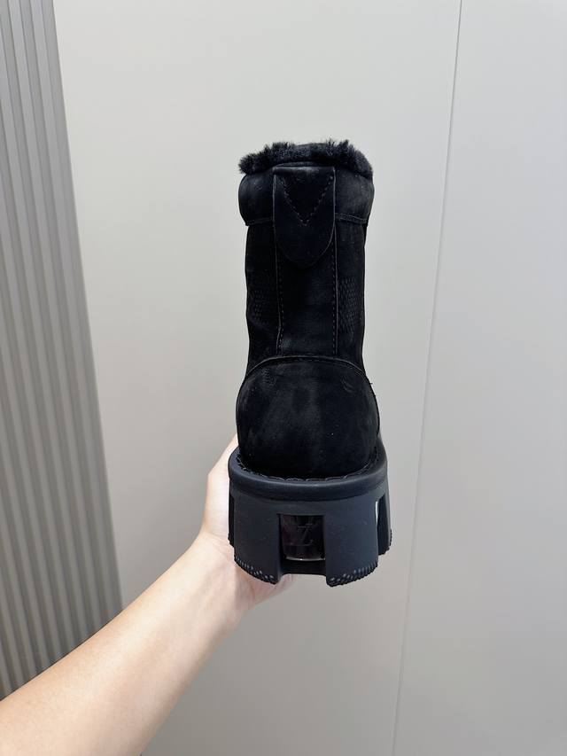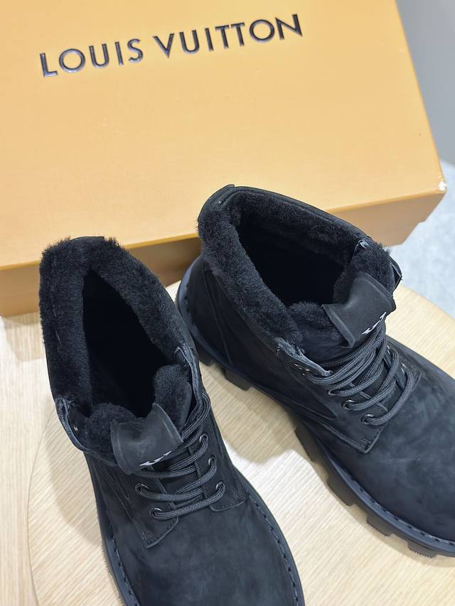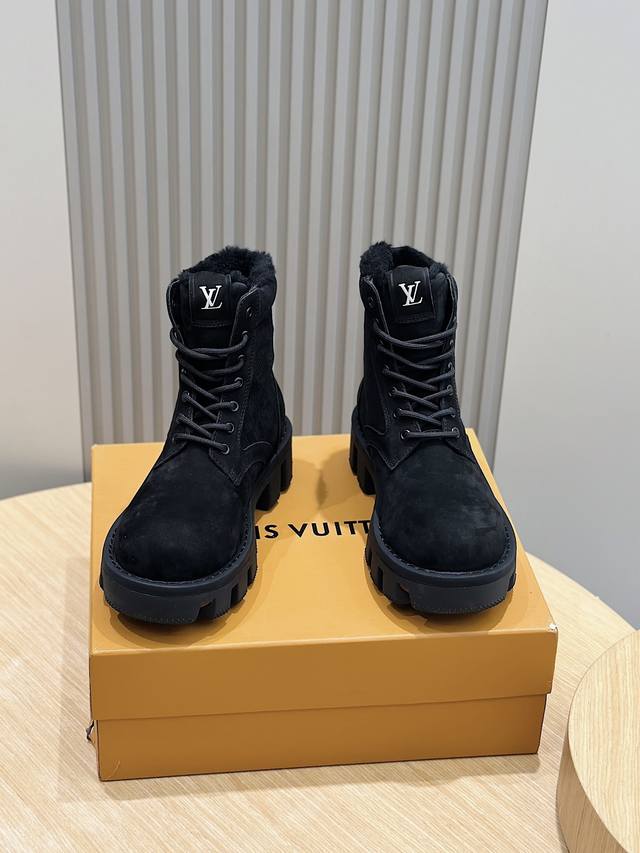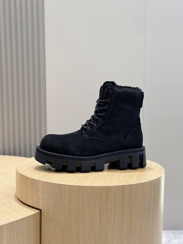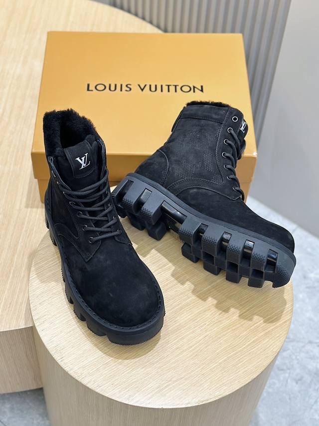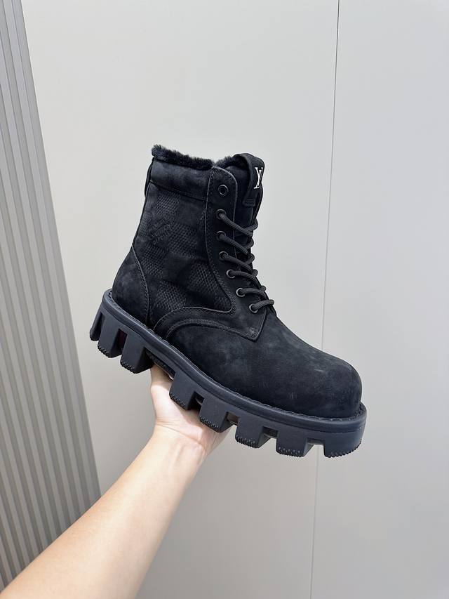 本款 Lv Checker 平底靴以正绒面牛皮革搭配舒暖羊毛皮内衬,以崭新风姿迈入冬季视野 鞋面局部压印 Damier 图案,凸纹外底延续相同元素 稳健鞋型演绎军靴风范,科技鞋带与便于穿脱的侧拉链彰显功能考量
