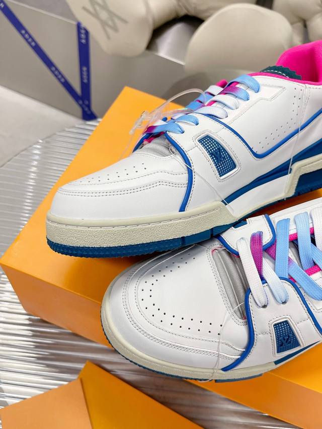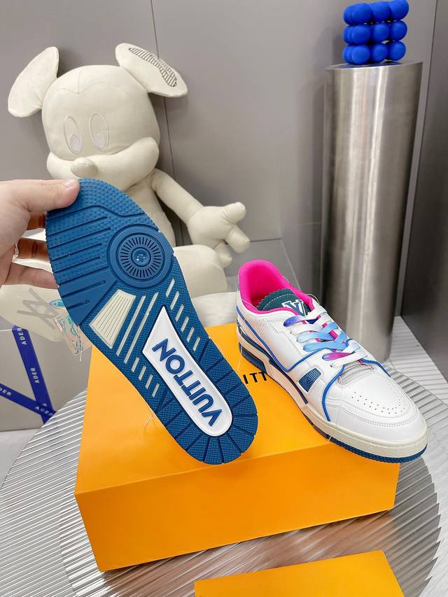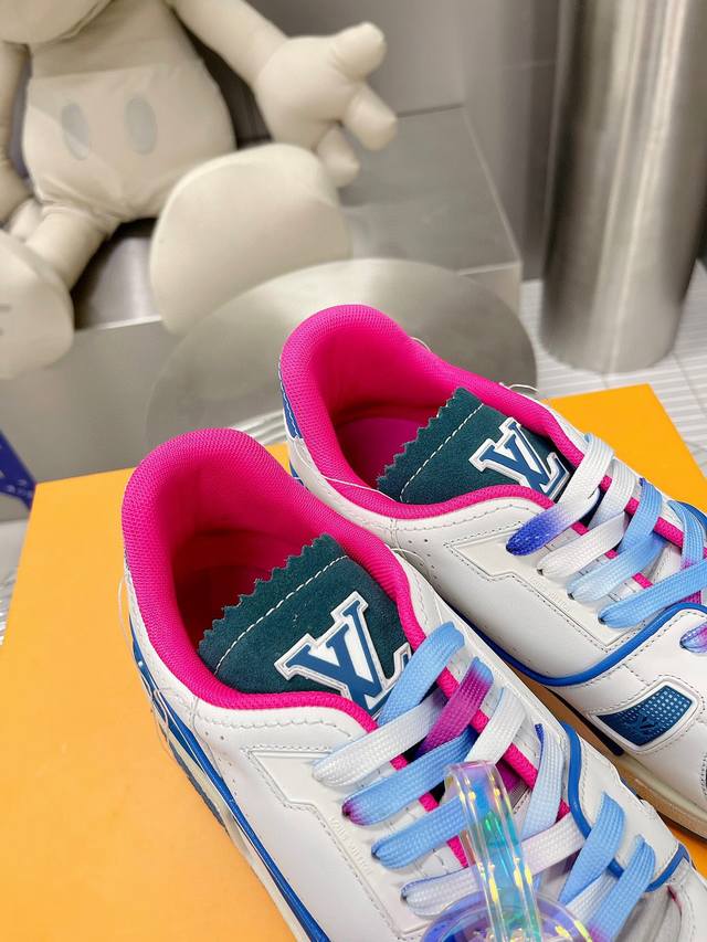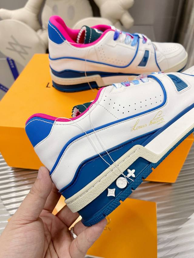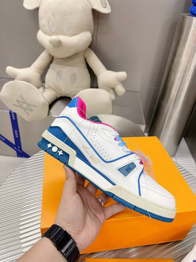编码:新款lv Trainer 男士运动鞋出货本款 Lv Trainer运动鞋选用粒面牛皮革演绎复古篮球鞋的灵感启发,再以明丽色调道出lv Colormania