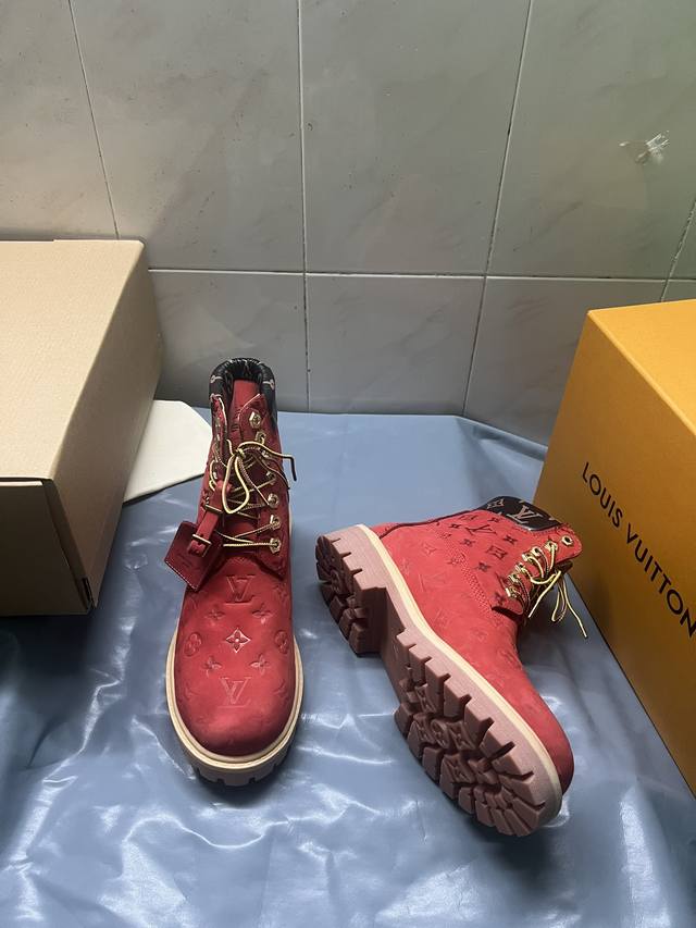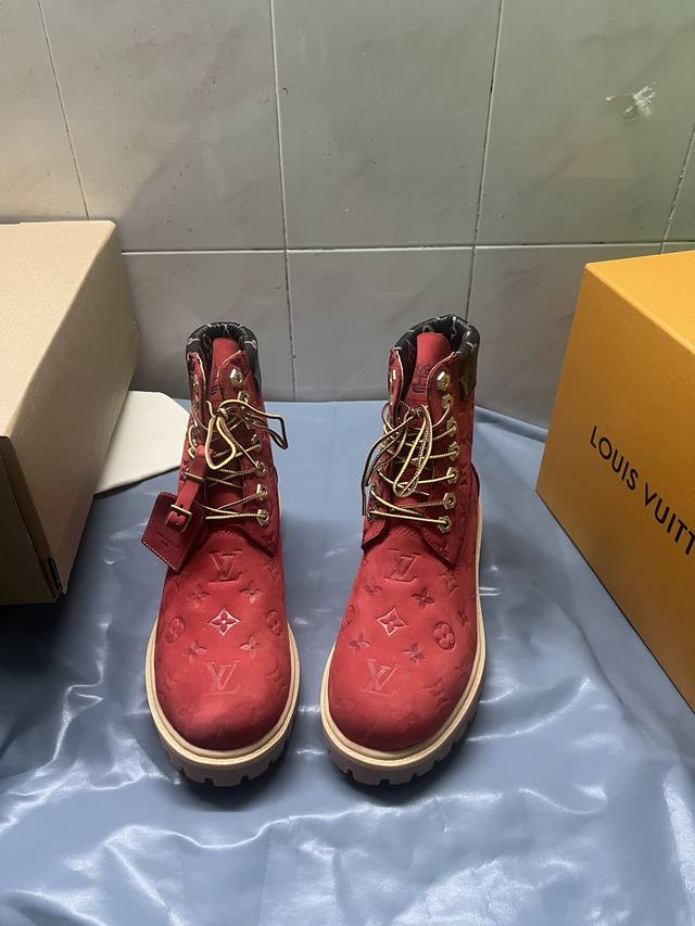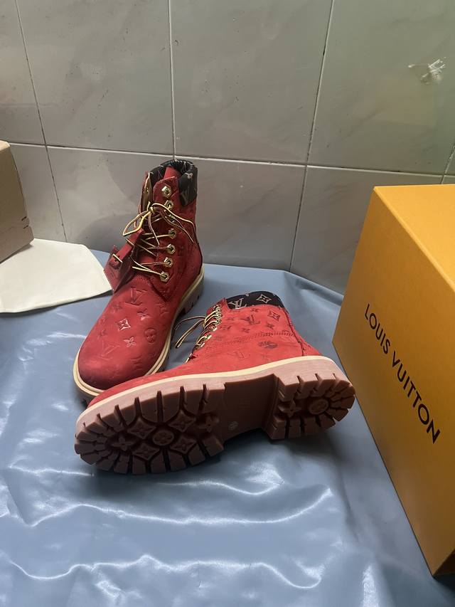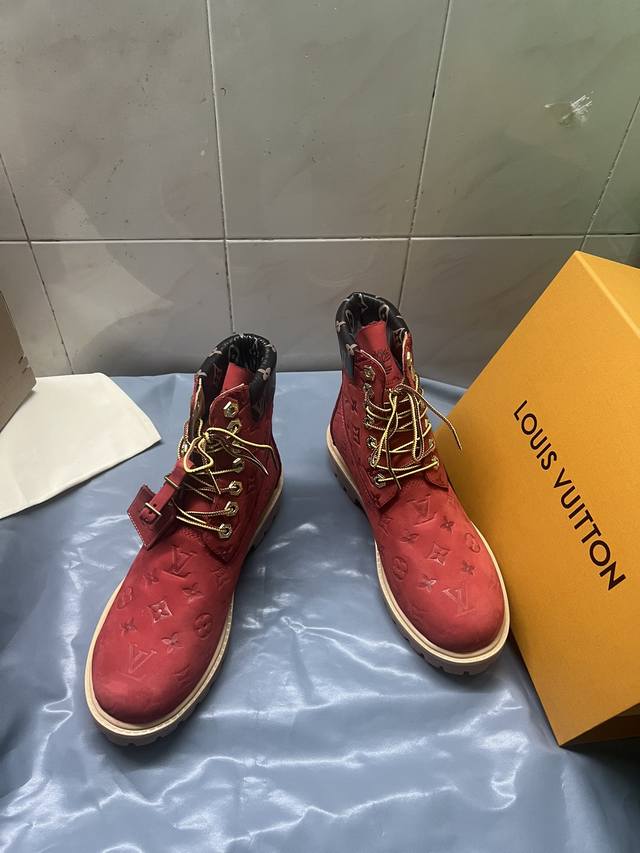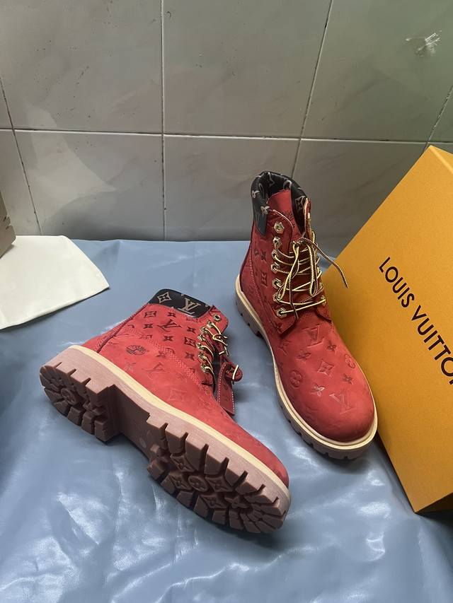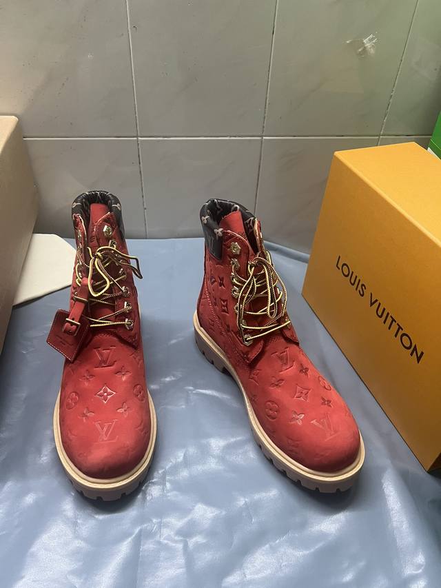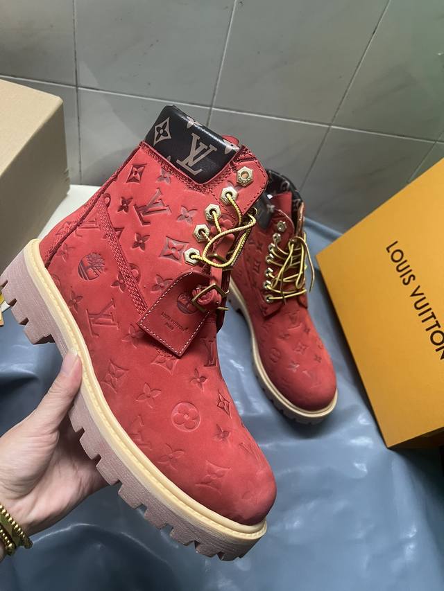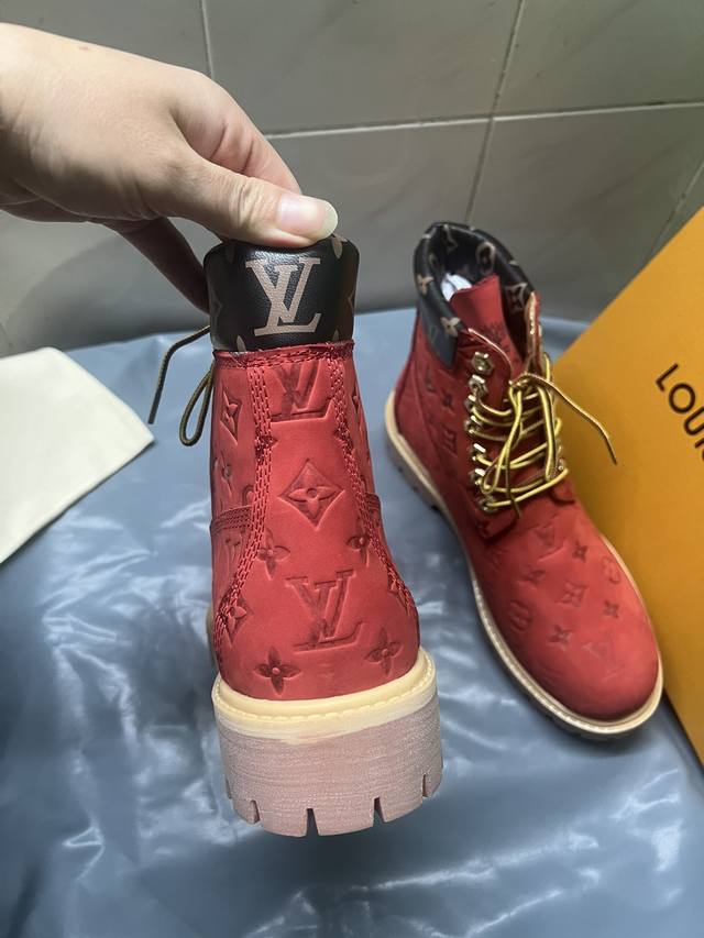 情侣款lv X Timberland 添柏岚 联名款 老花 压花 大黄靴 及踝靴 短靴