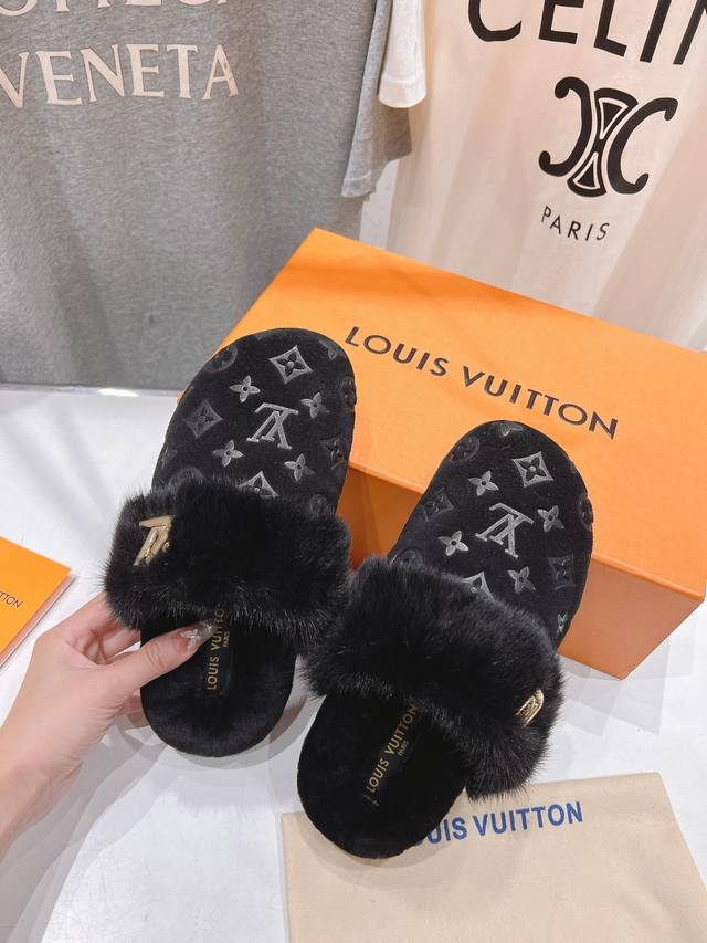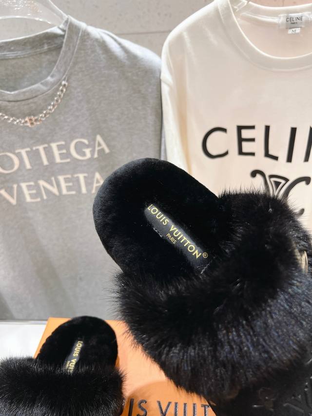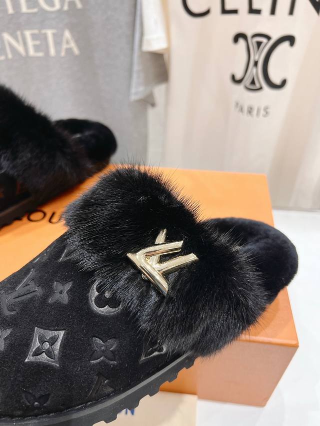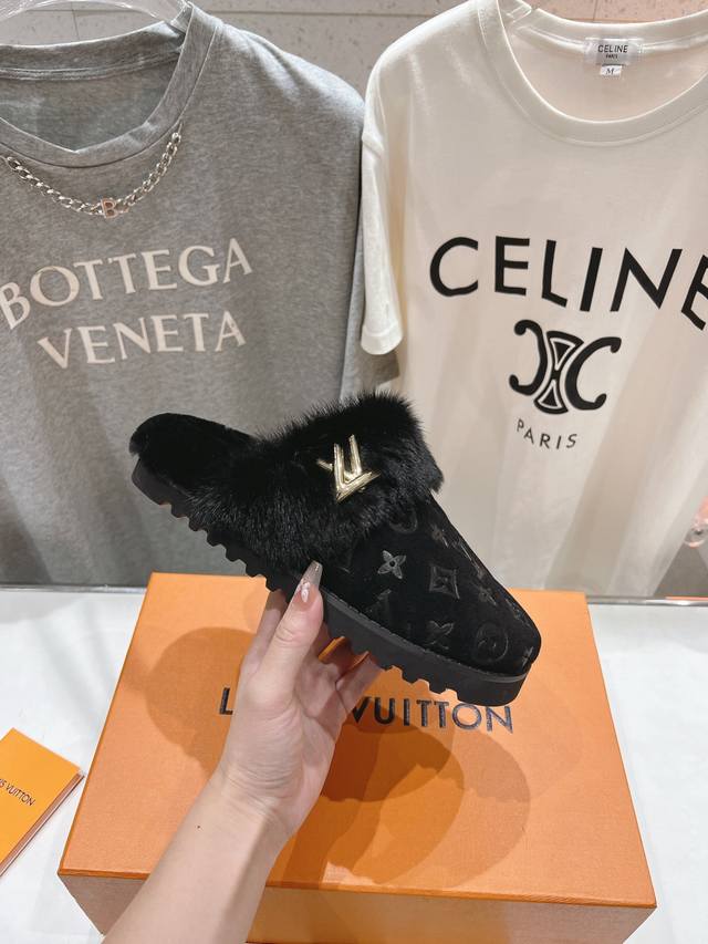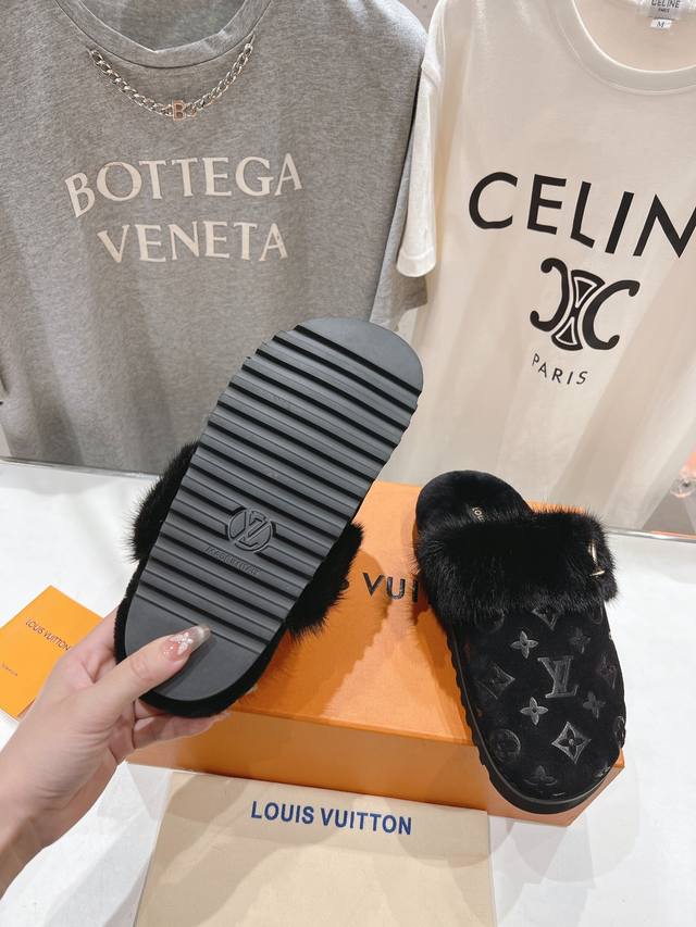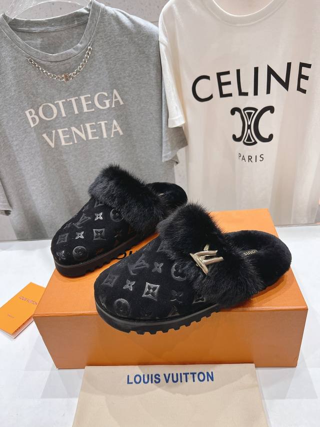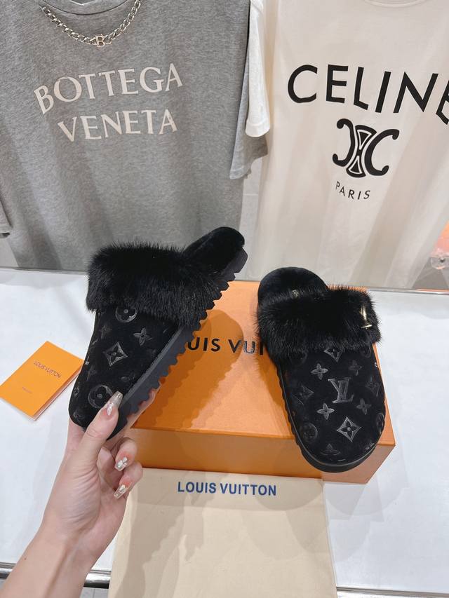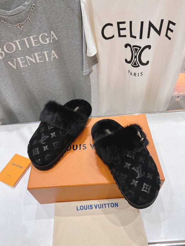 Louis Vuiton*L驴家 2024ss秋冬新款老花面包穆勒毛拖鞋