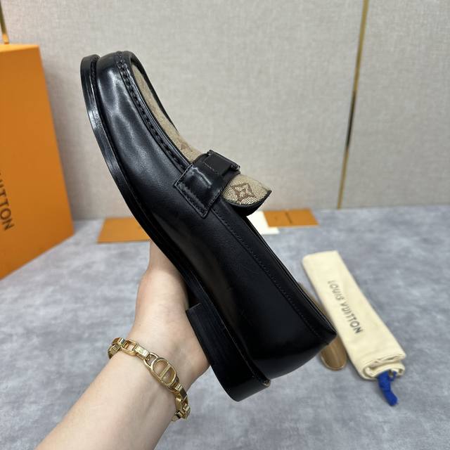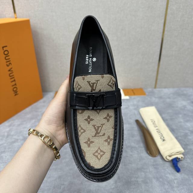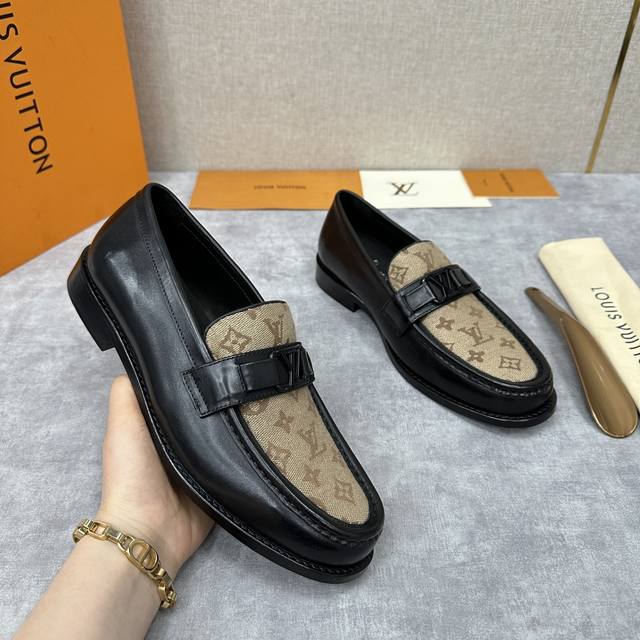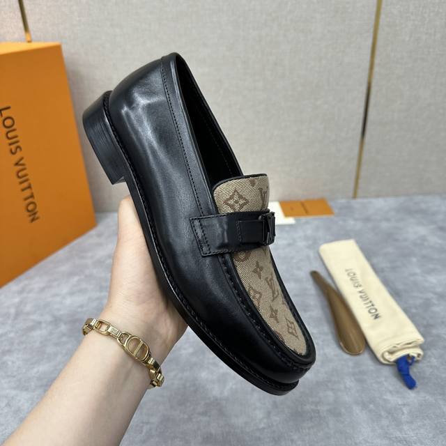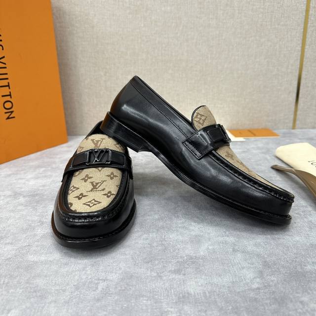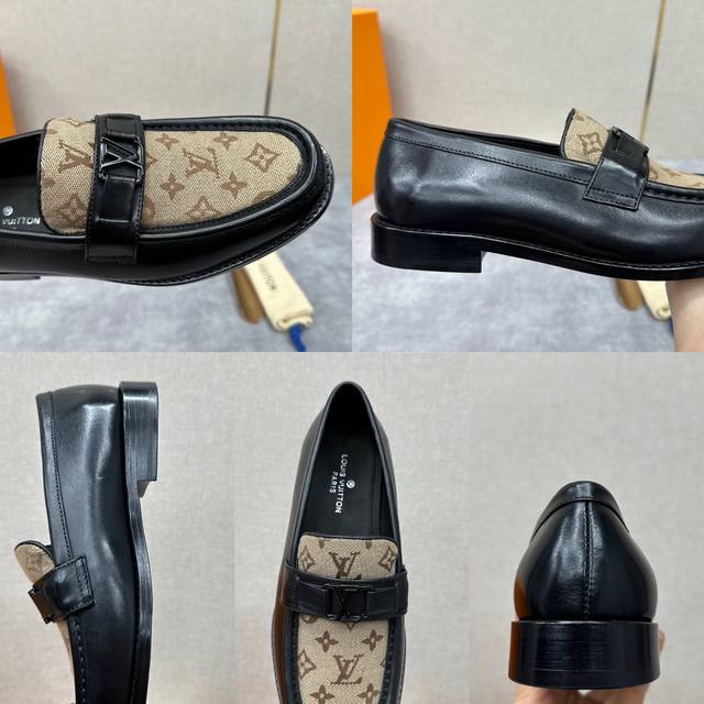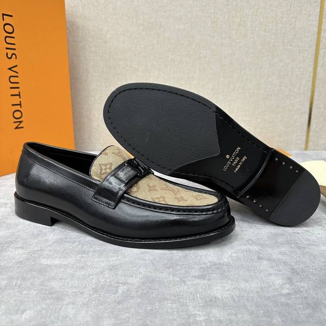 L家新品 Loui* 乐福鞋皮鞋 官方售价 Rmb,000 本款major乐福鞋正面选用monogram提花织物 拼接搭配皮革饰边 鞋面饰同色系皮革带 搭配金属l*V字母点缀传统手缝鞋面,内里黑色水染牛皮打造 脚感舒适亲肤 以潮流笔触升级传统设计。采用原版真皮大底 后跟外底饰有 Monogram花卉 前掌与后跟复合橡胶底片升级防滑性能提升舒适感。