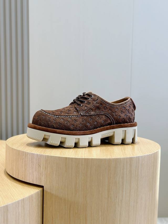 亮相于路易2024 春夏男装秀场,以正绒面牛皮革演绎多元风尚。鞋面品牌monogram压纹,厚实而轻盈的橡胶外底援引工装鞋设计。鞋底凸纹 Damier 图案点睛细节。