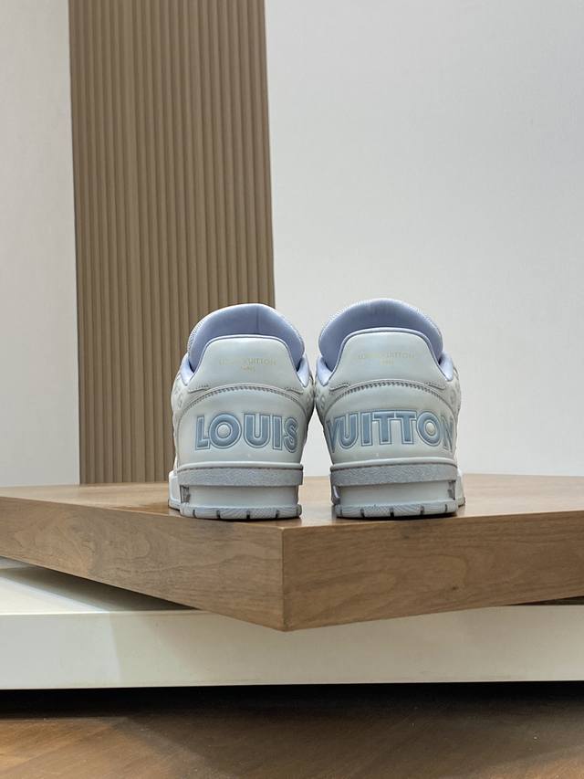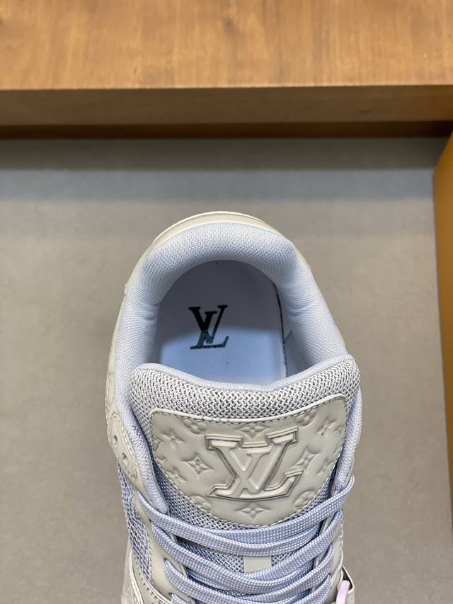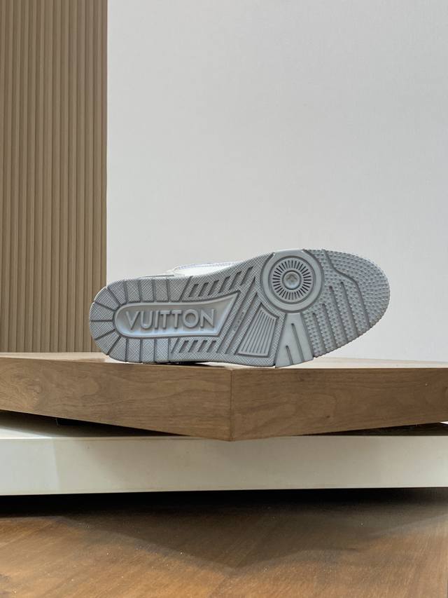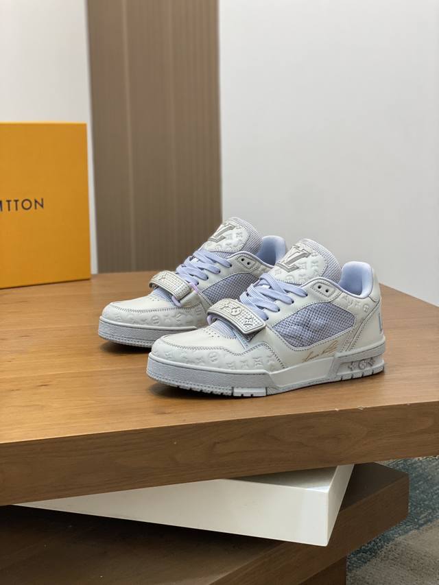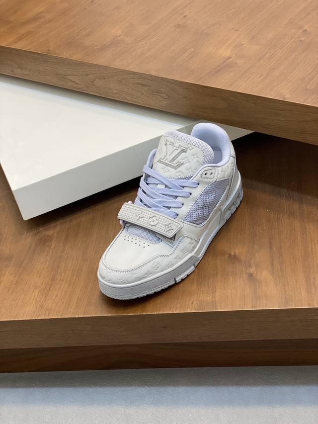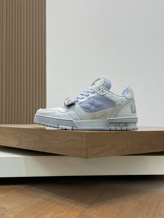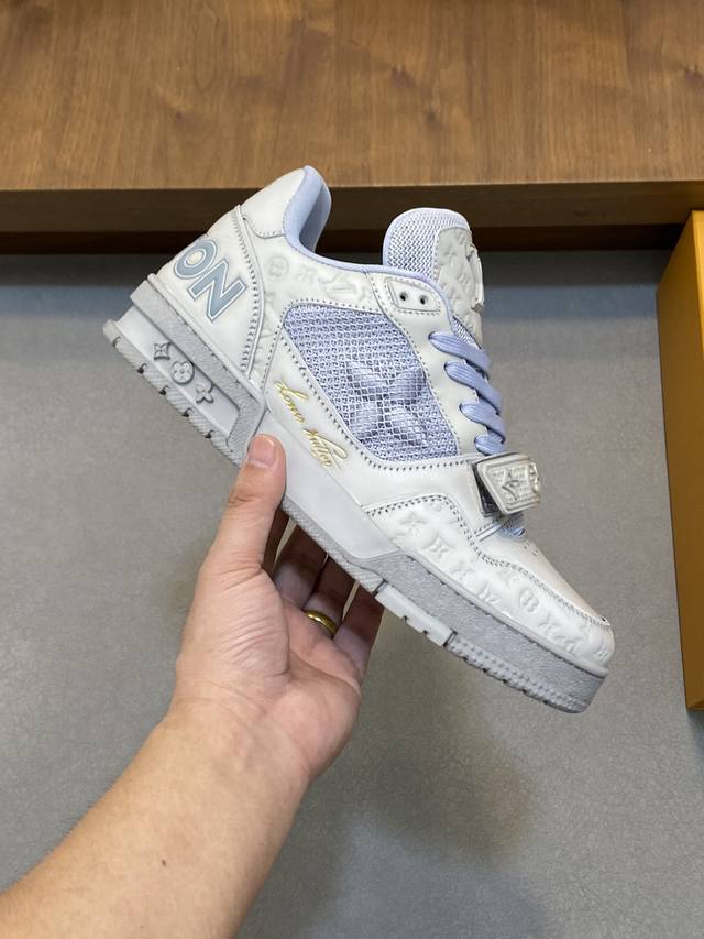 l 2024新配色,男士魔术贴trainer运动鞋 ,撞色超好看,此款trainer运动鞋采用进口牛皮制成。鞋身侧搭配网面设计,设计简洁,以男装艺术总监virgil Abloh所欣赏的复古篮球运动鞋为灵感,侧面饰有其手写的路易威登英文字样。科技橡胶外底配有创新凝胶内垫,舒适感更为出众。外底饰有monogram Flowers图案。经典的篮球鞋款,回头率杠杠的,搭配轻易,上脚透气舒适!