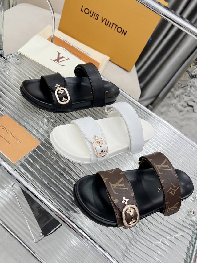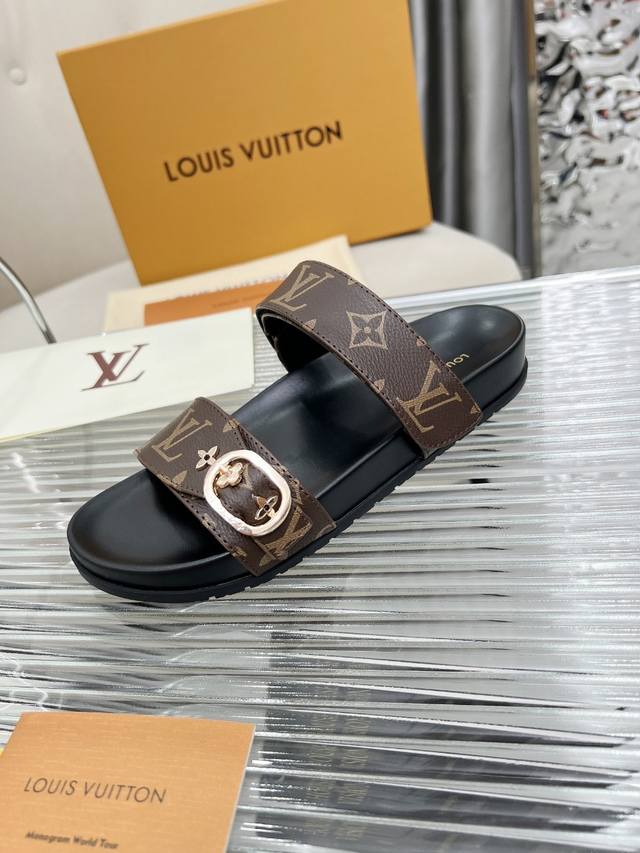 / louis Vuitton路易威登新款拖鞋火爆上市,1:1高级定制,秒杀一切仿品,原版开模Logo冲孔装饰,既时尚又美观,面料:小牛皮,内里羊皮,精美原版鞋楦,