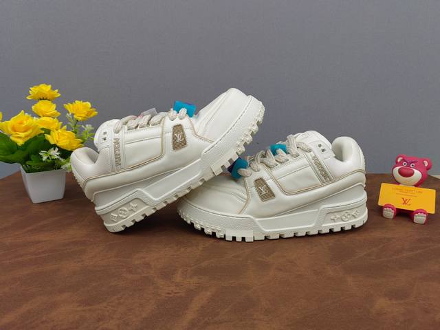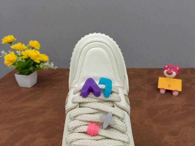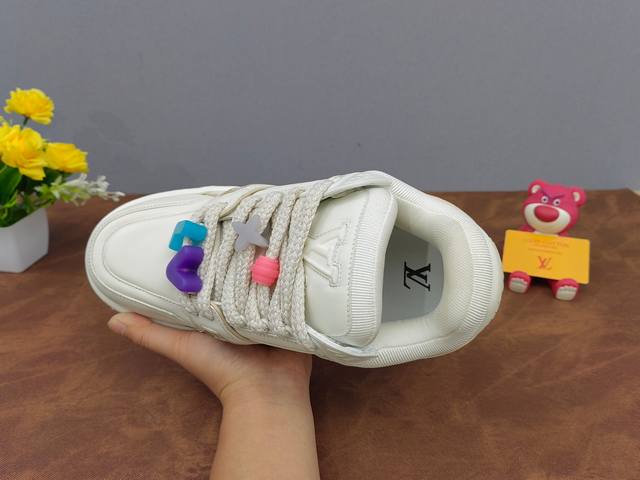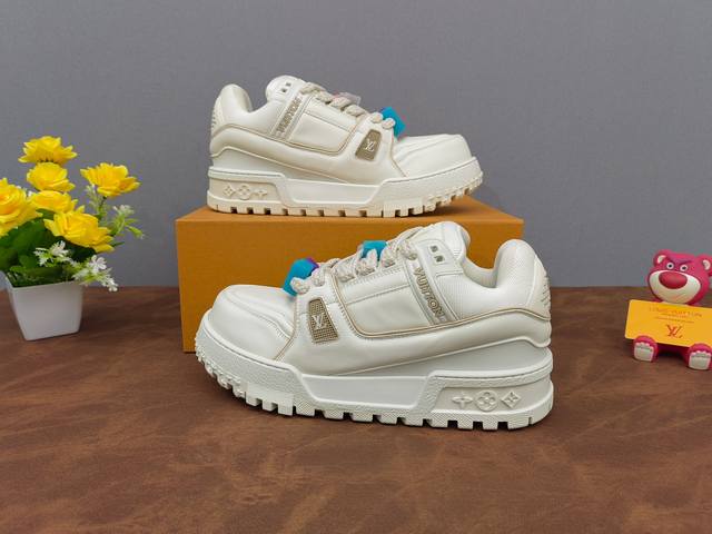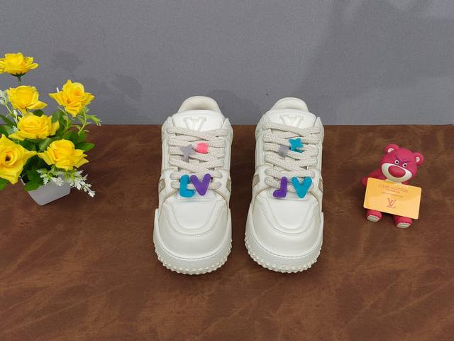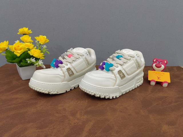 LV驴牌L家23春夏走秀款 胖Trainer 面包鞋 滑板鞋 休闲 情侣款 运动鞋 DIY串珠Louis vuitton 路易威登年男装春夏走秀款,这双“变胖”了的Trainer好受瞩目!立体饱满的彩色鞋身,搭配鞋带上的撞色字母和Logo,整只鞋看起来好像橡皮泥捏的一样,在潮酷之间充满了童心配送专柜精美包装面料: 原版定制进口头层牛皮内里: 原版定制透气网里大底: 原版开模TPU组合大底底厚: 3.5CMsize: 女款35-41男款39-46。