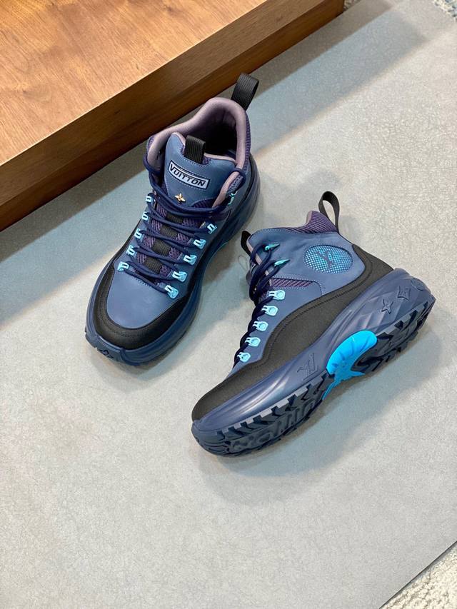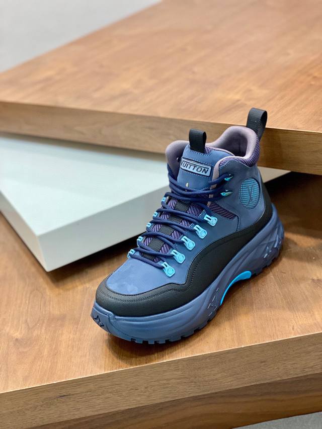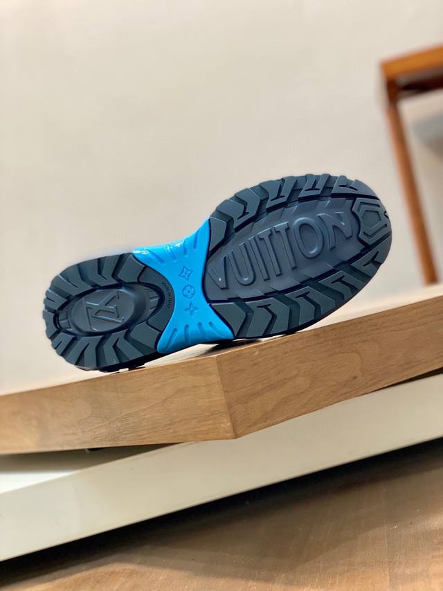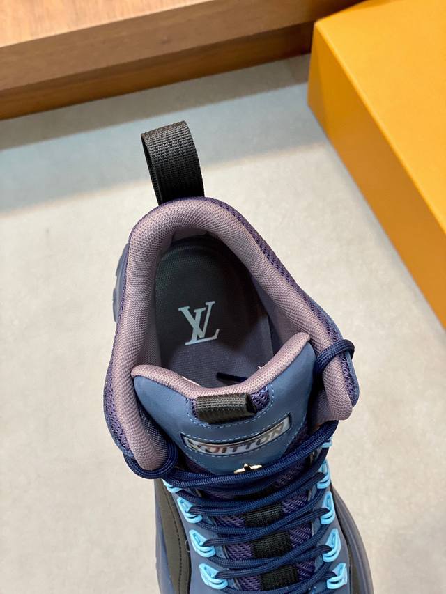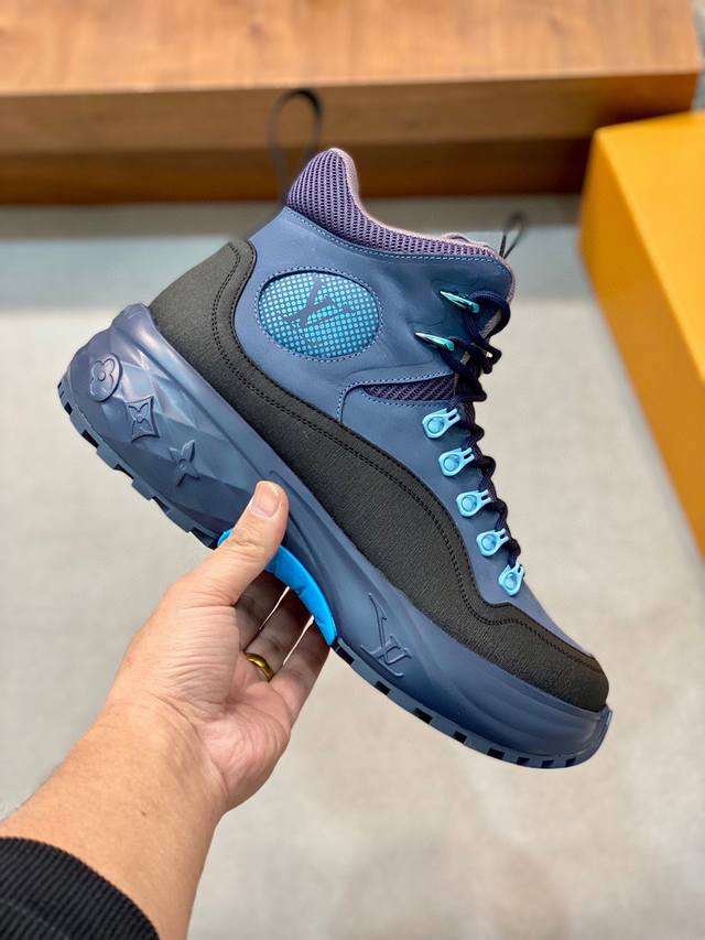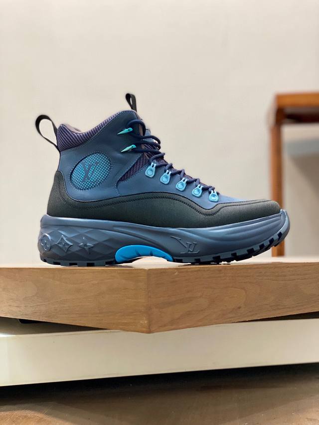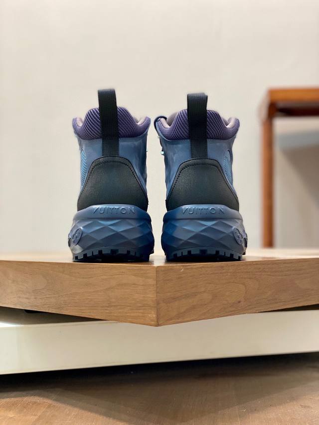 本款 Lv Discovery 及踝靴自登山鞋汲取灵感,以混合科技材质彰显运动风范。 轻盈回弹的橡胶外底提供强劲抓地力,Monogram 花卉和 Vuitton 标识分饰外底和鞋舌。