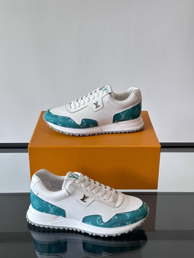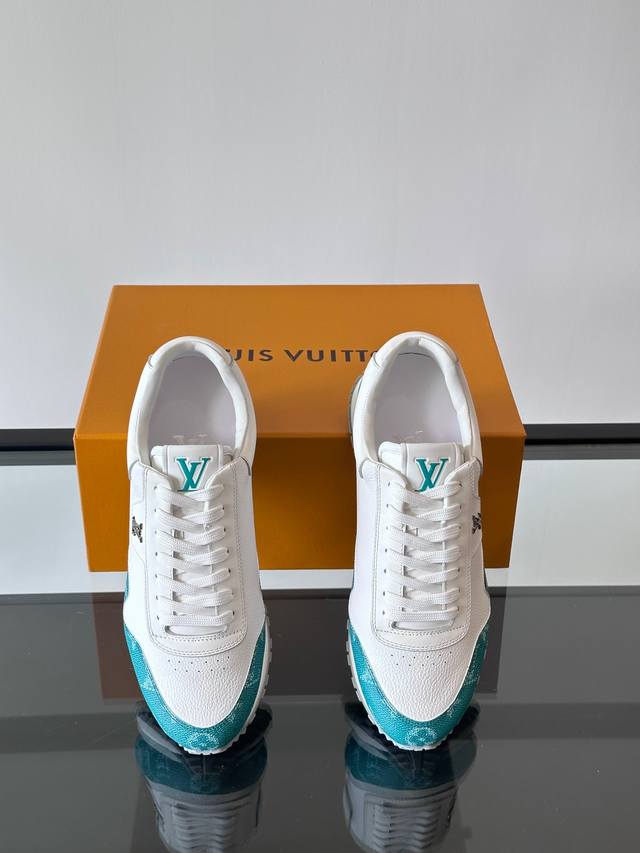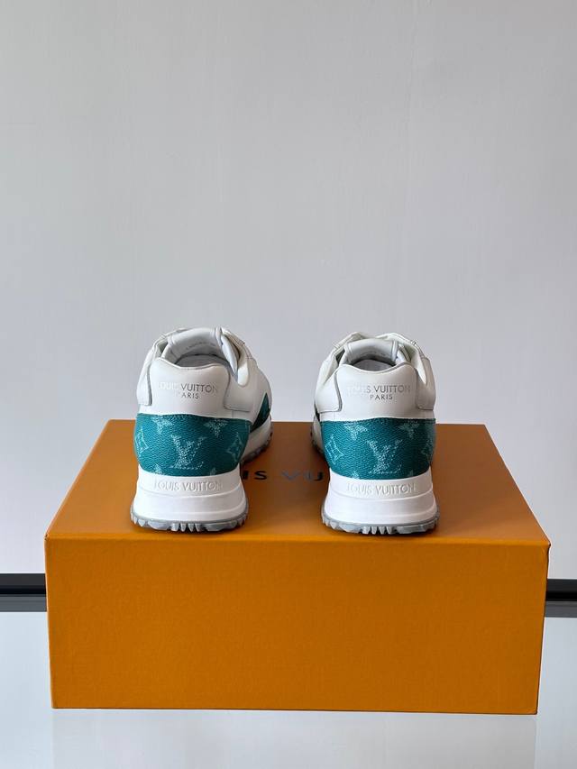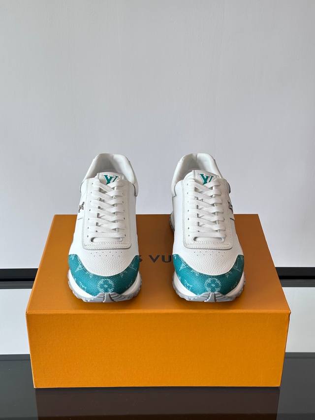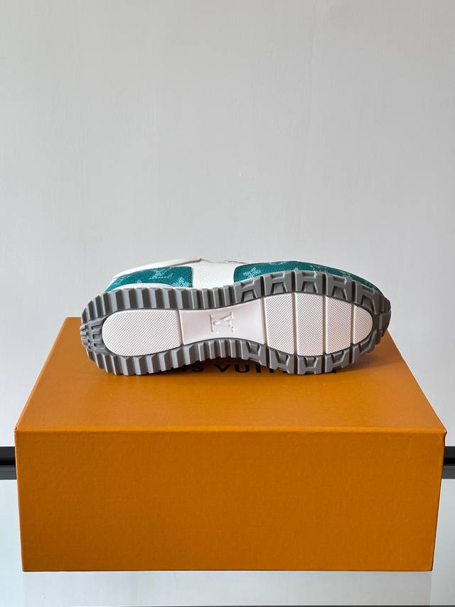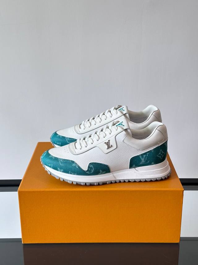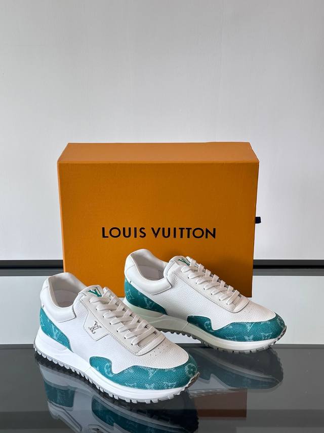 / L.V Run Away 运动鞋,本款 Run Away 运动鞋选用头层牛皮拼透气原版材质,楔形橡胶外底延续跑鞋设计,缀 Monogram 花卉,L V字母标注