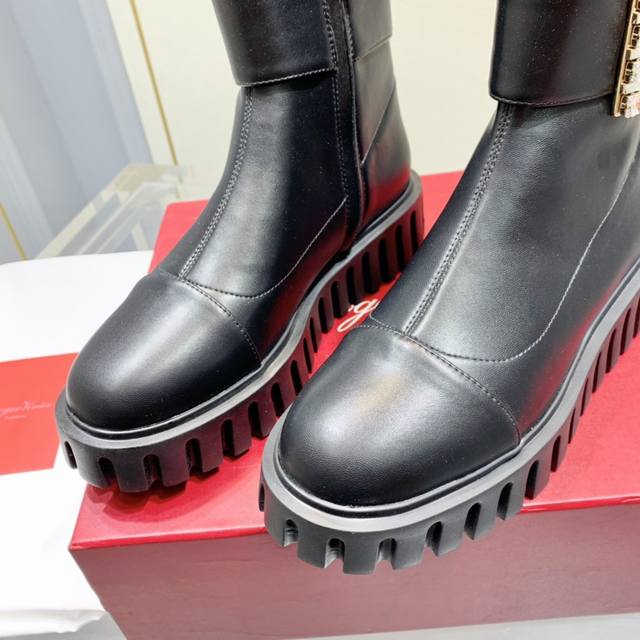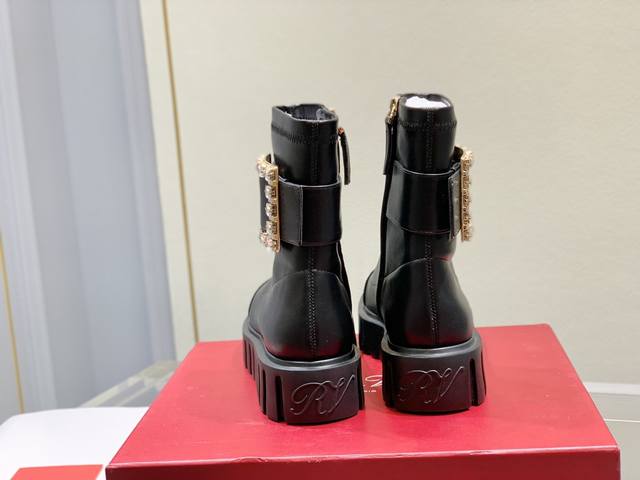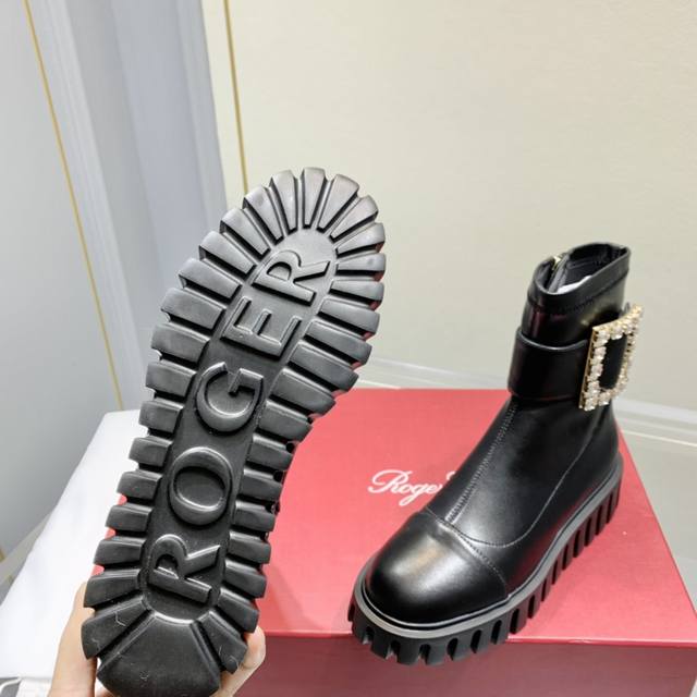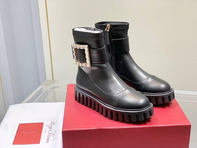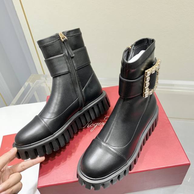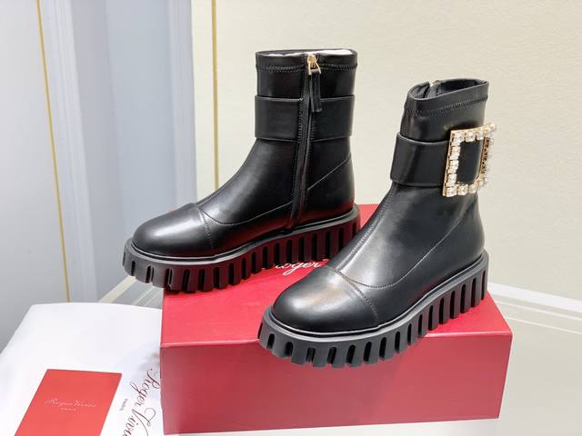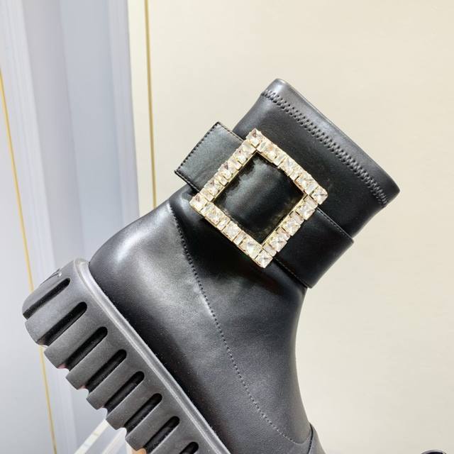 代购版 Roger Vivi2024秋冬新款 Viv Go Thick弹力裸靴子水晶方钻扣厚底短靴 材质:全羊皮 正码:35-39订做40 底厚:5Cm