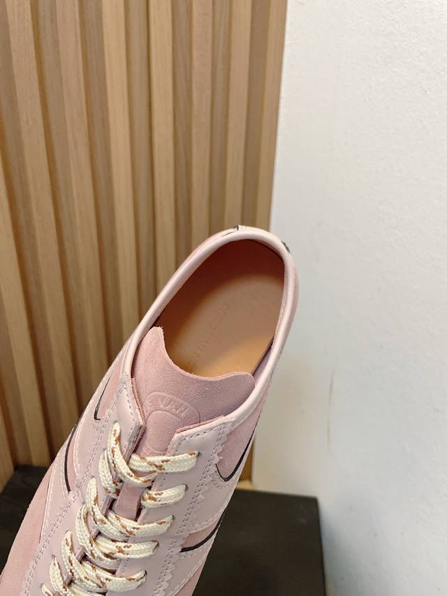 新一季的麂皮运动鞋,灵感来源于70年代的马拉松竞技运动。鞋型以马拉松运动鞋为设计原型,搭配极具生命力色彩的绿色、红色、橙色等 Dvn代表性的色彩,鞋面由麂皮、柔软牛皮等材质拼接而成,并搭配今年流行的尼龙扭绳鞋带,实用性与时尚性得到完美的平衡!