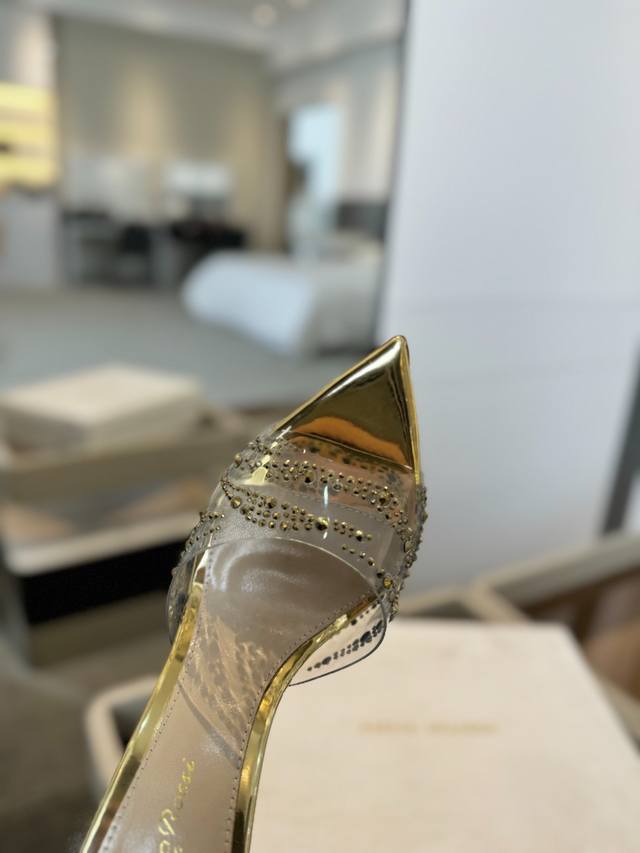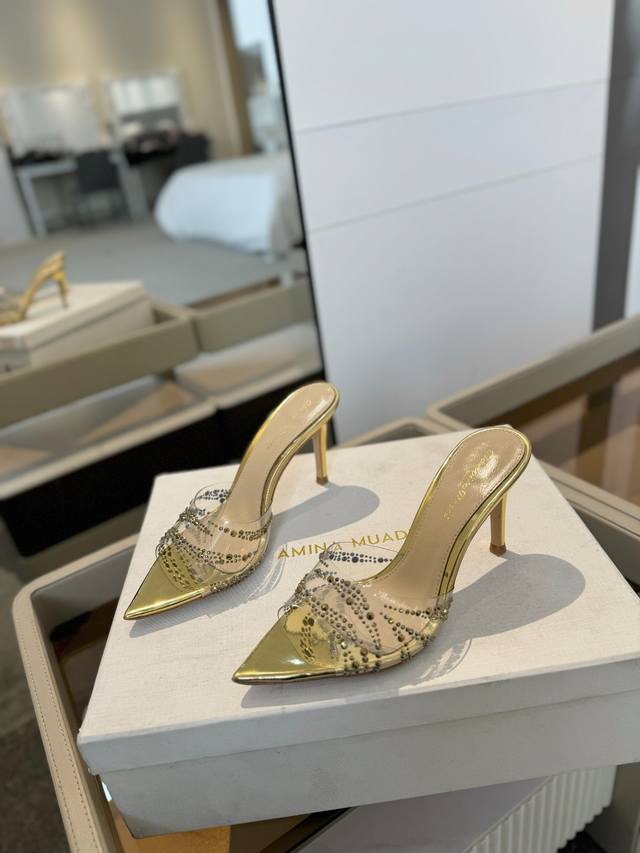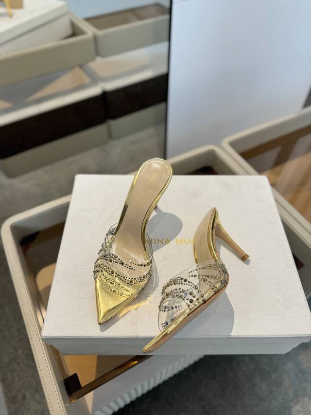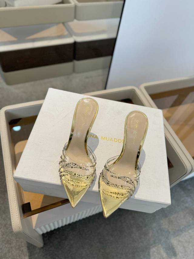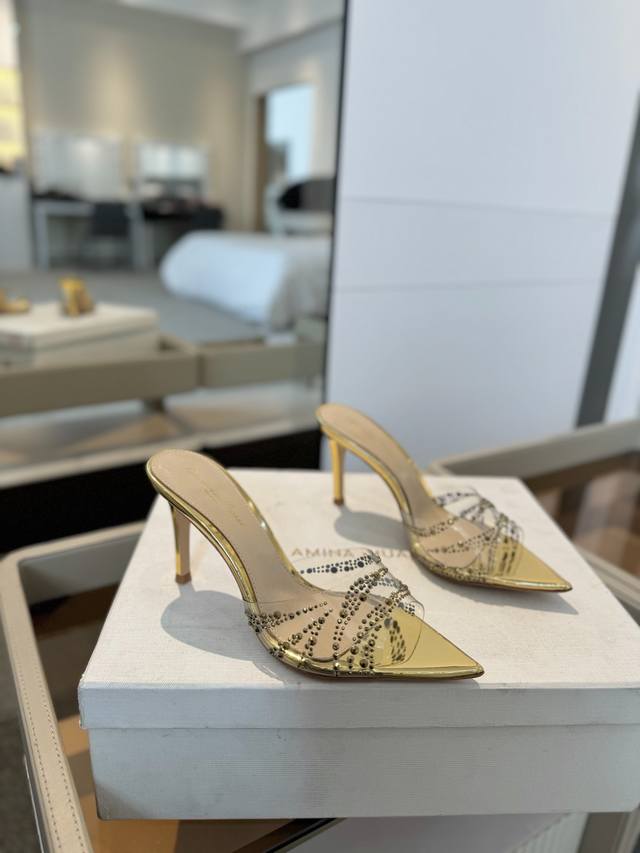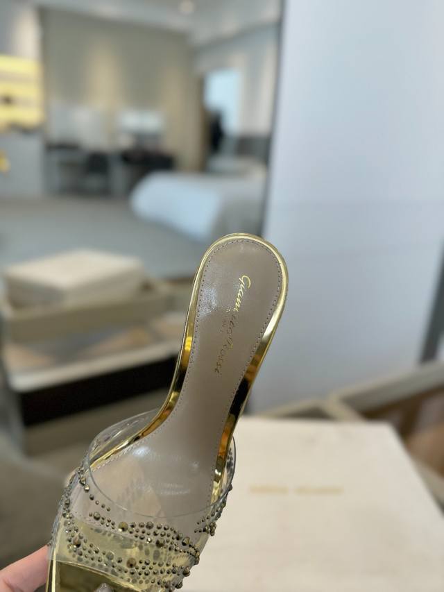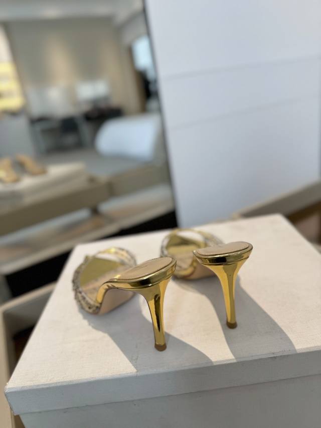 Eiko Stiletto,轻松移动。这款 Gianvito Rossi 拖鞋采用配有精致的烫钻,可抚摸脚踝并滑过脚部。凉鞋搭配细高跟,性感而精致。