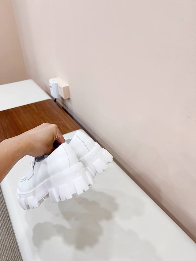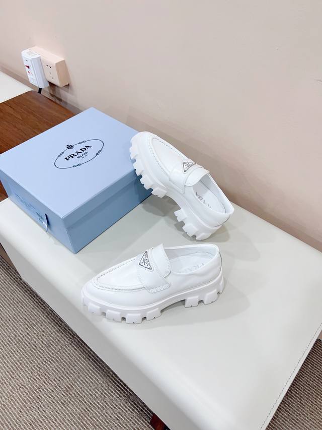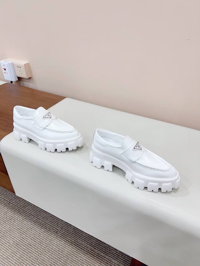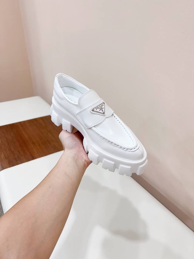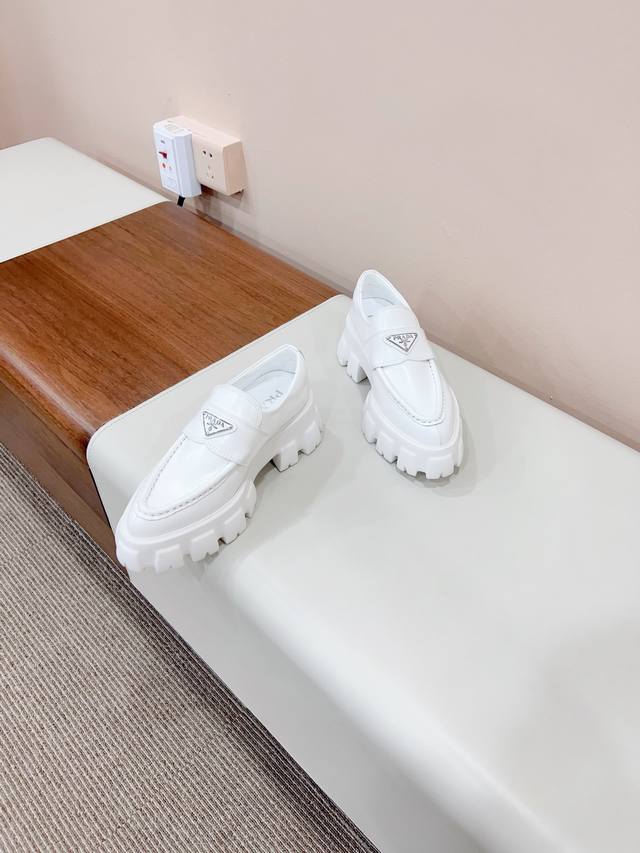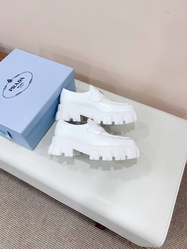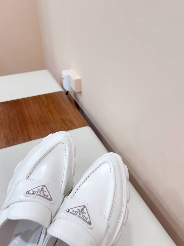 这款前卫而别致的乐福鞋演绎品牌美学语言中的二元性理念。摩登的大号鞋底呈现别出心裁的厚重感设计,与考究的亮面皮革鞋面开启巧妙对话。 融汇矛盾对立的意象,混搭之间不失和谐,塑造隽永的廓形。涂珐琅金属三角形徽标装饰展现品牌标志性元素。