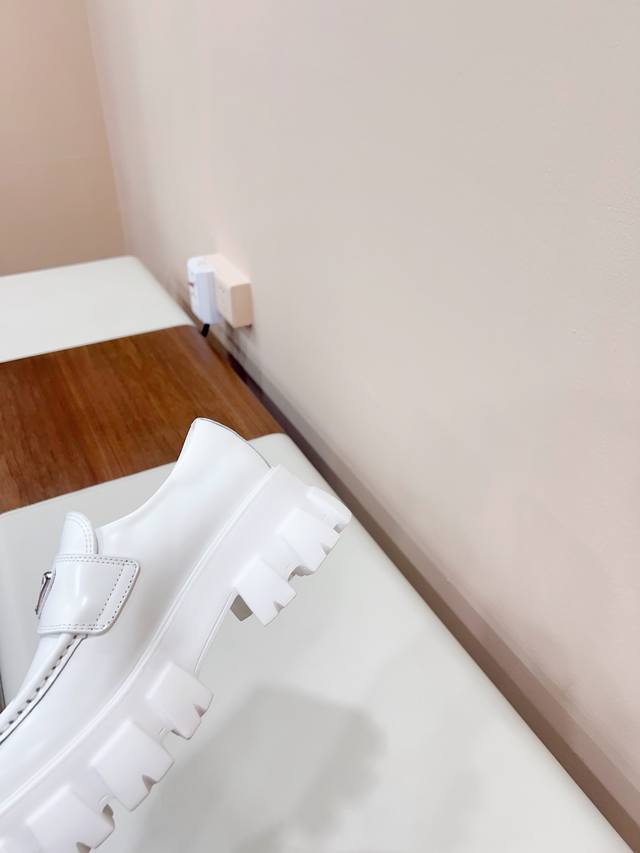 鞋面:进口开边珠 漆皮牛皮 涂珐琅金属三角形徽标
