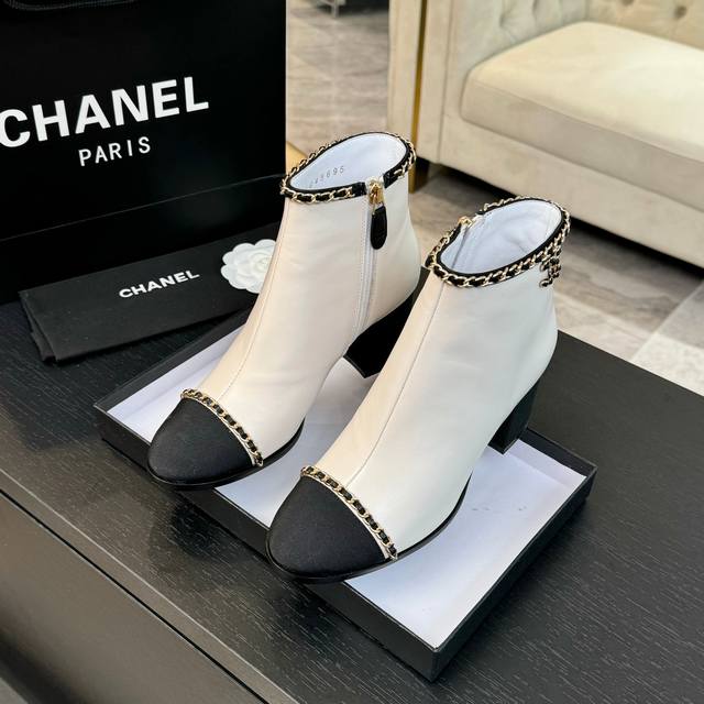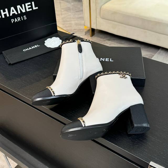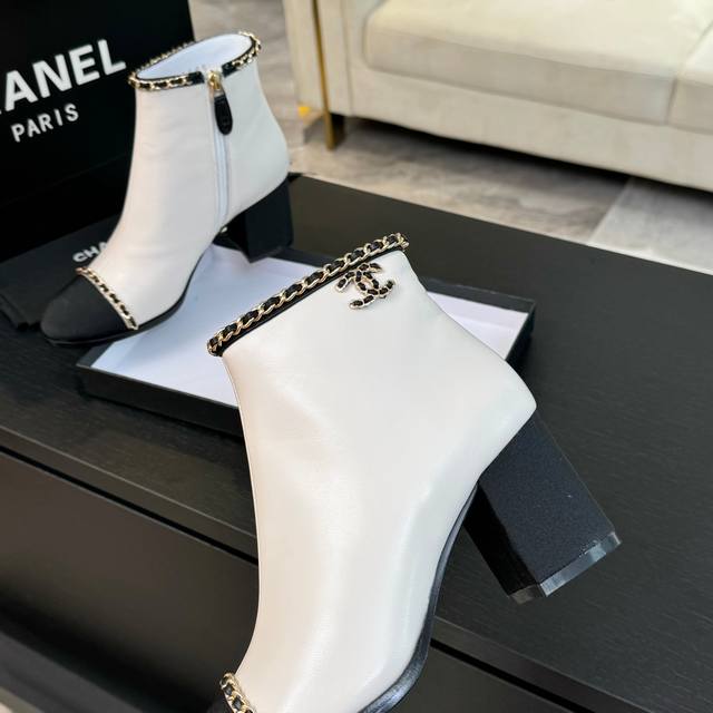 24Ss秋冬新款chanel小香双c链条粗跟短靴