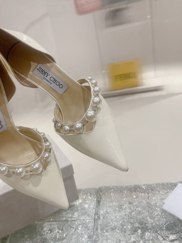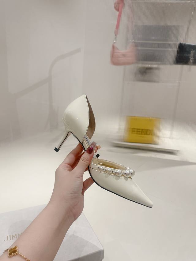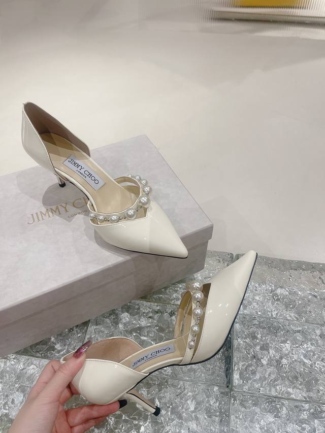 出厂价 吉米周系列高跟鞋,甄选拿铁色、裸色、黑色漆皮革。鞋型精美夺目,尖头配以8.5和6.5厘米细高跟,以及闪闪白色珍珠点缀的单条足弓带,是您轻松打造从早到晚多变时尚的造型。