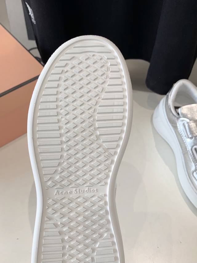 出厂价 Acne Studios 秋冬新款, 厚底轻便魔术贴休闲鞋。由经典笑脸小白鞋升级,搭载厚度 6.5Cm 超轻大底,皮面细腻有光泽,弹性和柔软度也相当 O