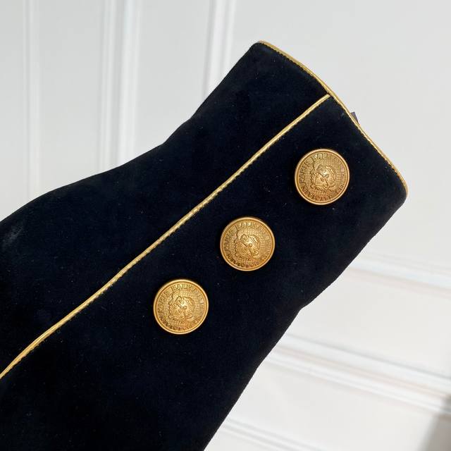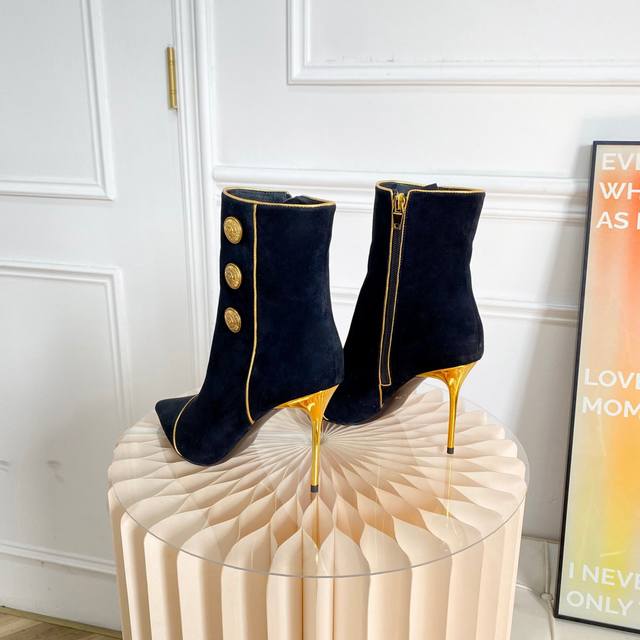 此款抛光金色饰面,内部有拉链,侧面有三个签名纽扣皮革鞋底!