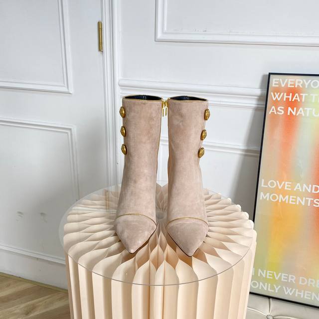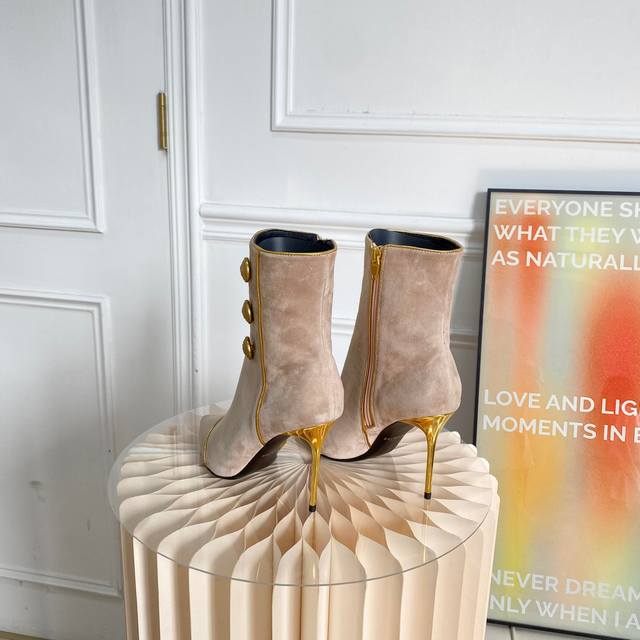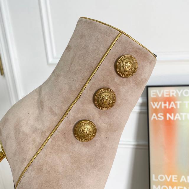 此款抛光金色饰面,内部有拉链,侧面有三个签名纽扣皮革鞋底!