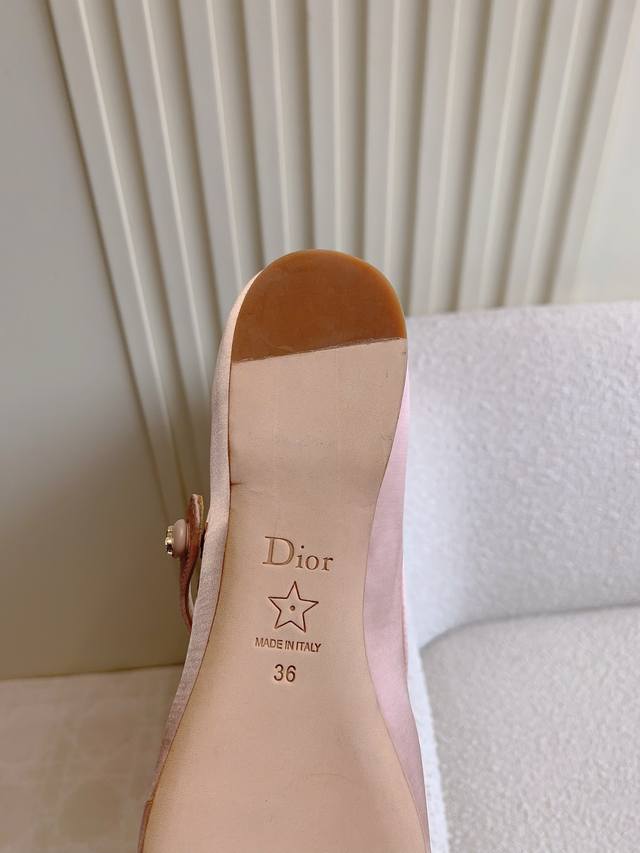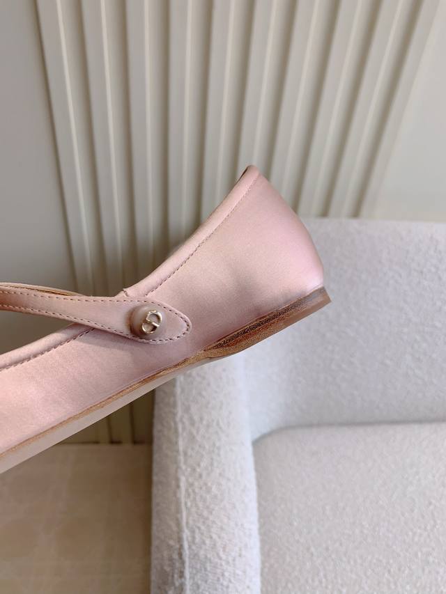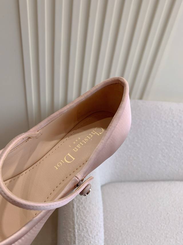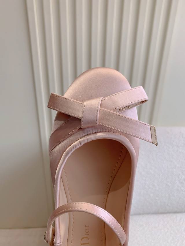 真丝缎面面料鞋面,搭配圆形鞋头设计,正面饰以同色调解构效果蝴蝶结,弹力系带与点缀以金色调Cd 标志的装饰性纽扣相得益彰。搭配加垫皮革内底和 4厘米粗跟,精致舒适,可与各式高雅造型搭配。